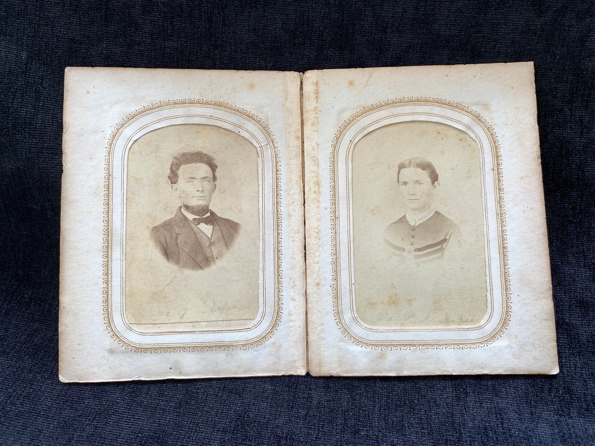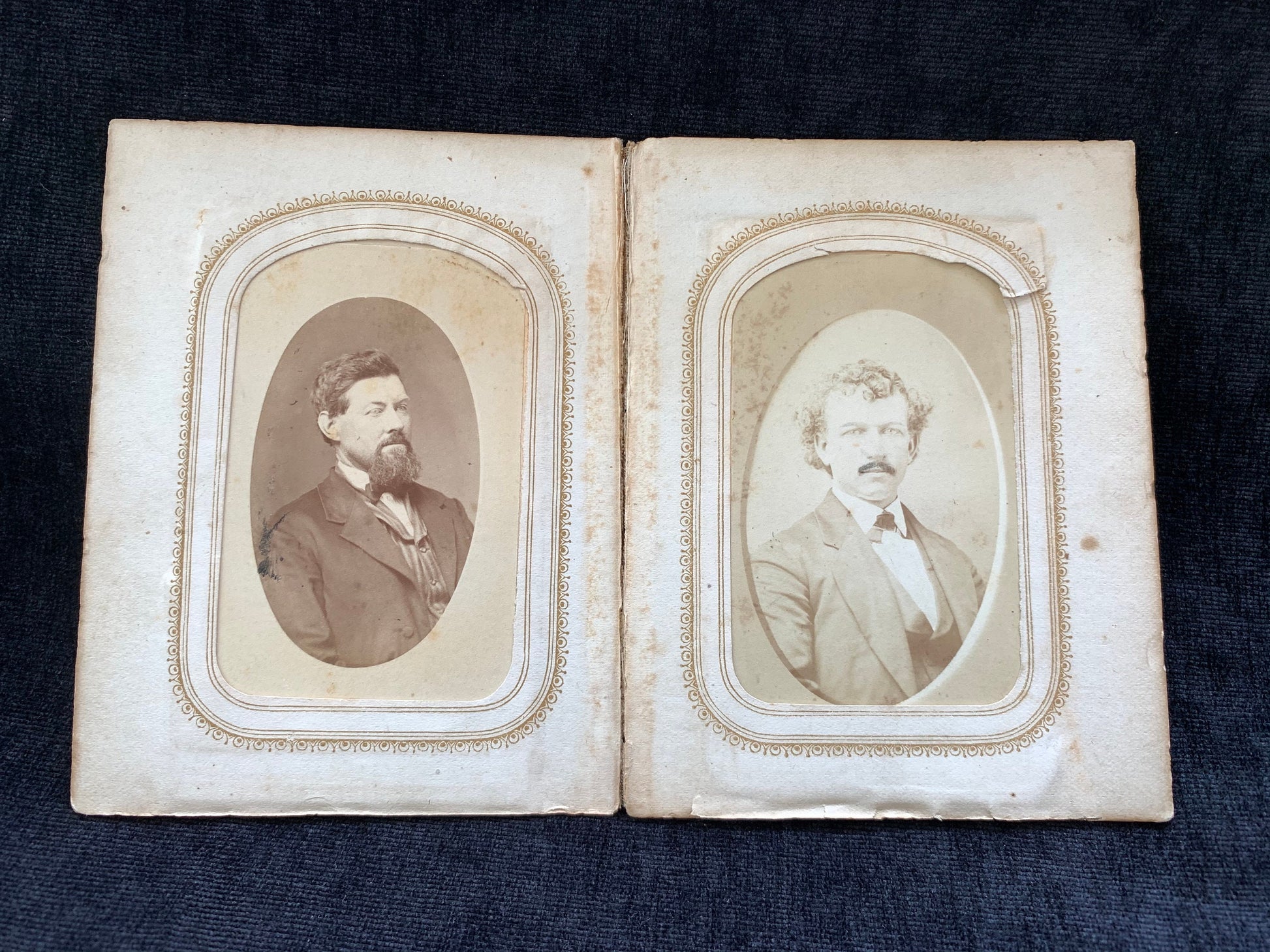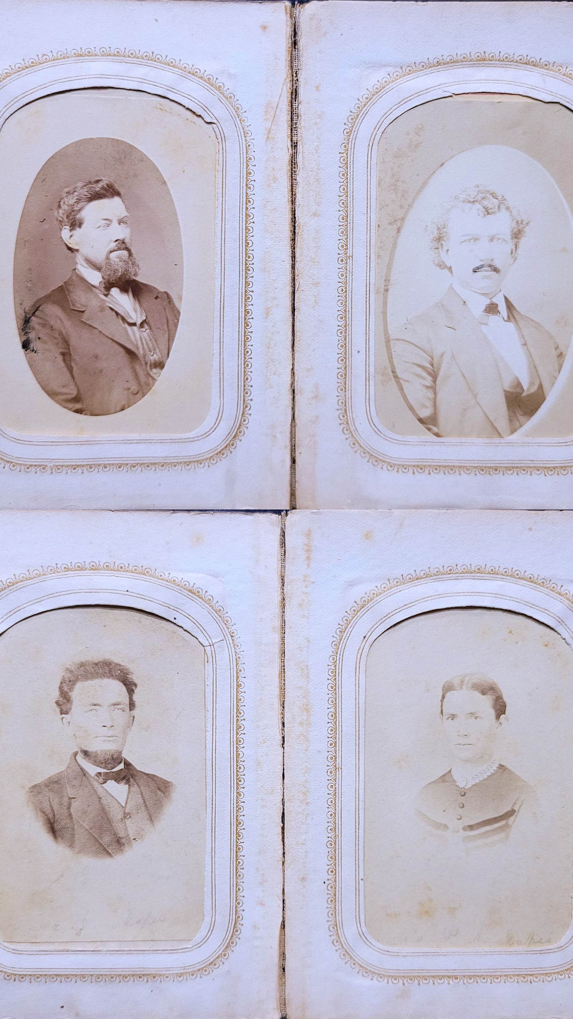 This is a very interesting piece! It is a set of four photos, two on each side, held together like they were pages in a photo album. Some of the binding can still be seen. One side features a two portraits of two different men, and the other side features a portrait of a man and a portrait of a woman. The names of the man and woman were written at the bottom of their photos but have faded beyond legibility. None of the individuals are smiling, as was common in most photos from this time period, as the subject had to sit still for quite some time while the photograph was being taken. These were likely taken in the 1860s or 1870s.