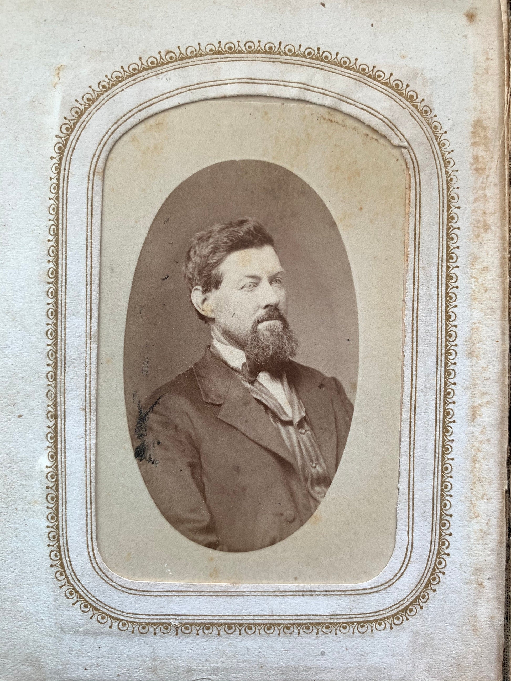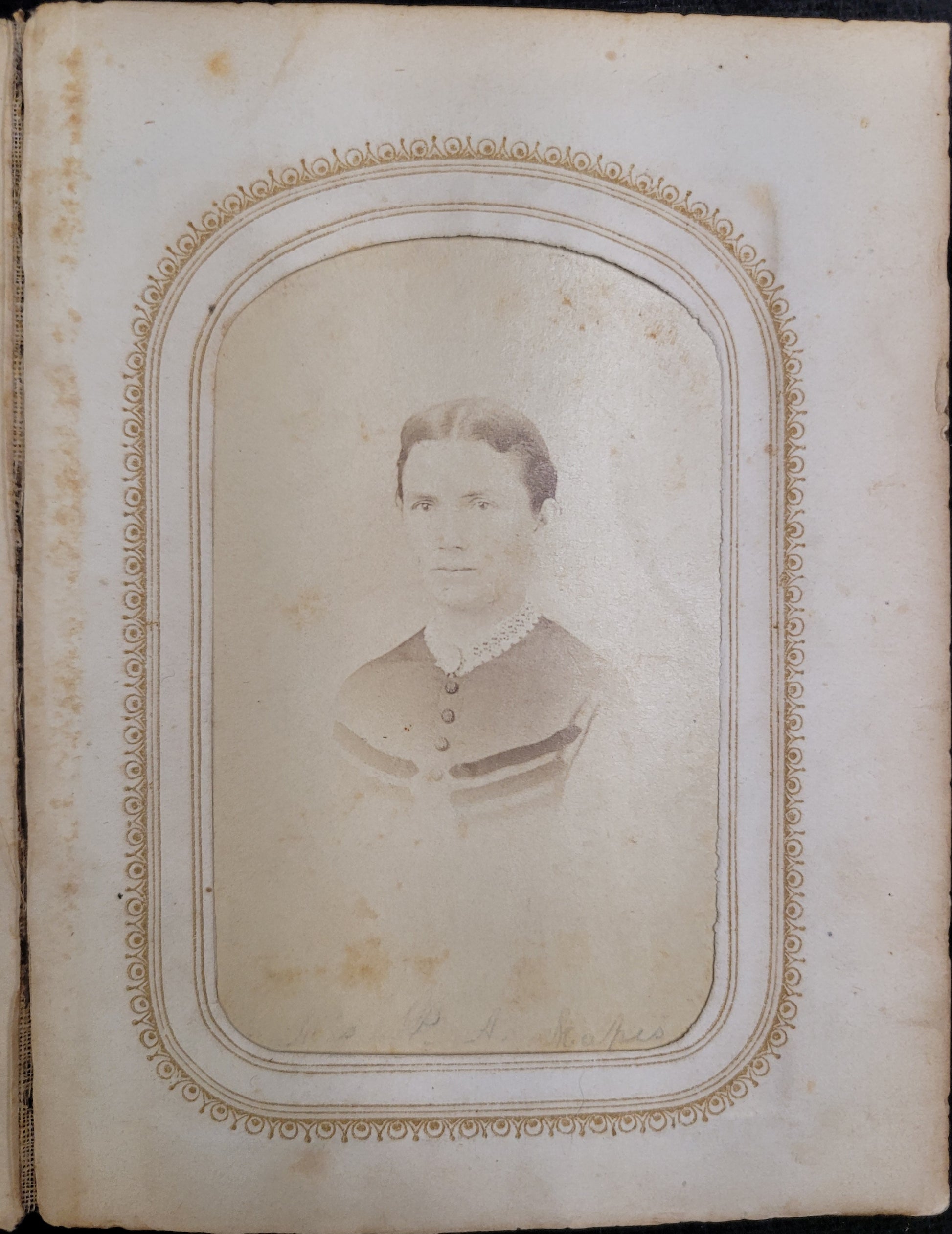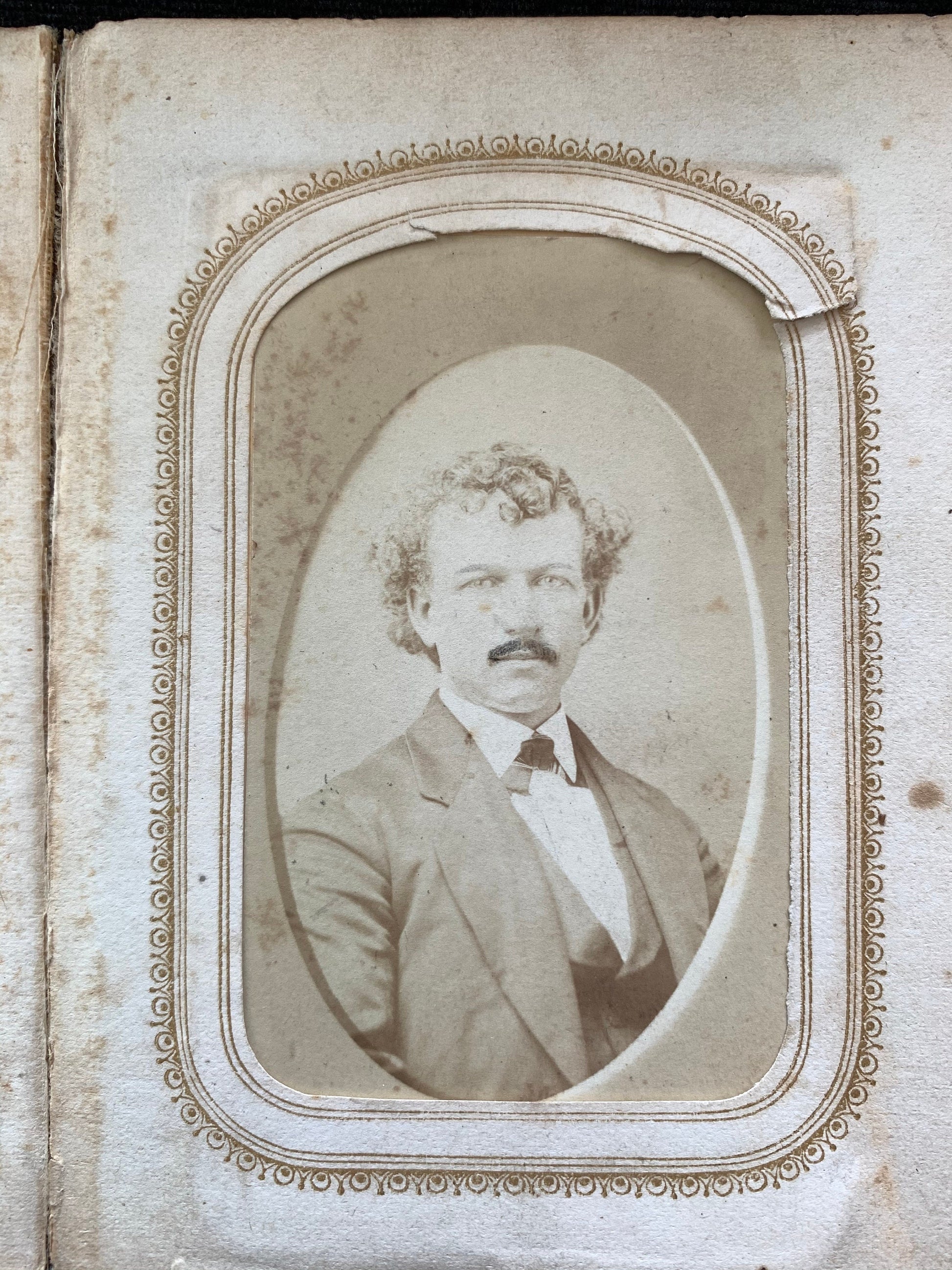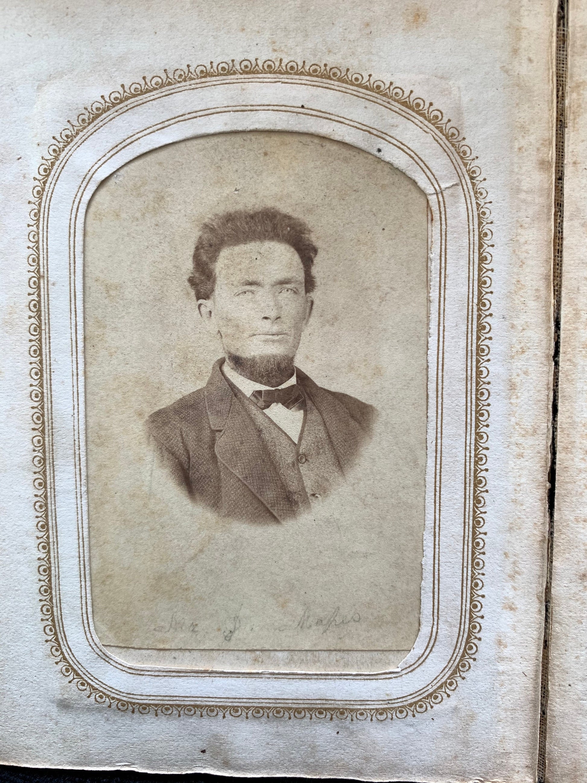This is a very interesting piece! It is a set of four photos, two on each side, held together like they were pages in a photo album. Some of the binding can still be seen. One side features a two portraits of two different men, and the other side features a portrait of a man and a portrait of a woman. The names of the man and woman were written at the bottom of their photos but have faded beyond legibility. None of the individuals are smiling, as was common in most photos from this time period, as the subject had to sit still for quite some time while the photograph was being taken. These were likely taken in the 1860s or 1870s.