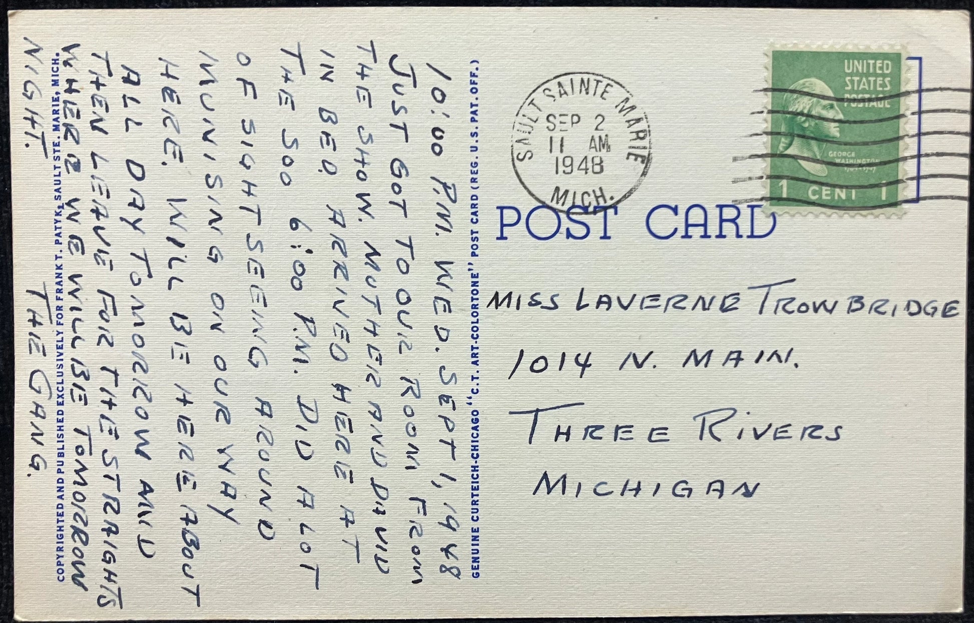 Mailed on September 2, 1948. Green one-cent George Washington stamp