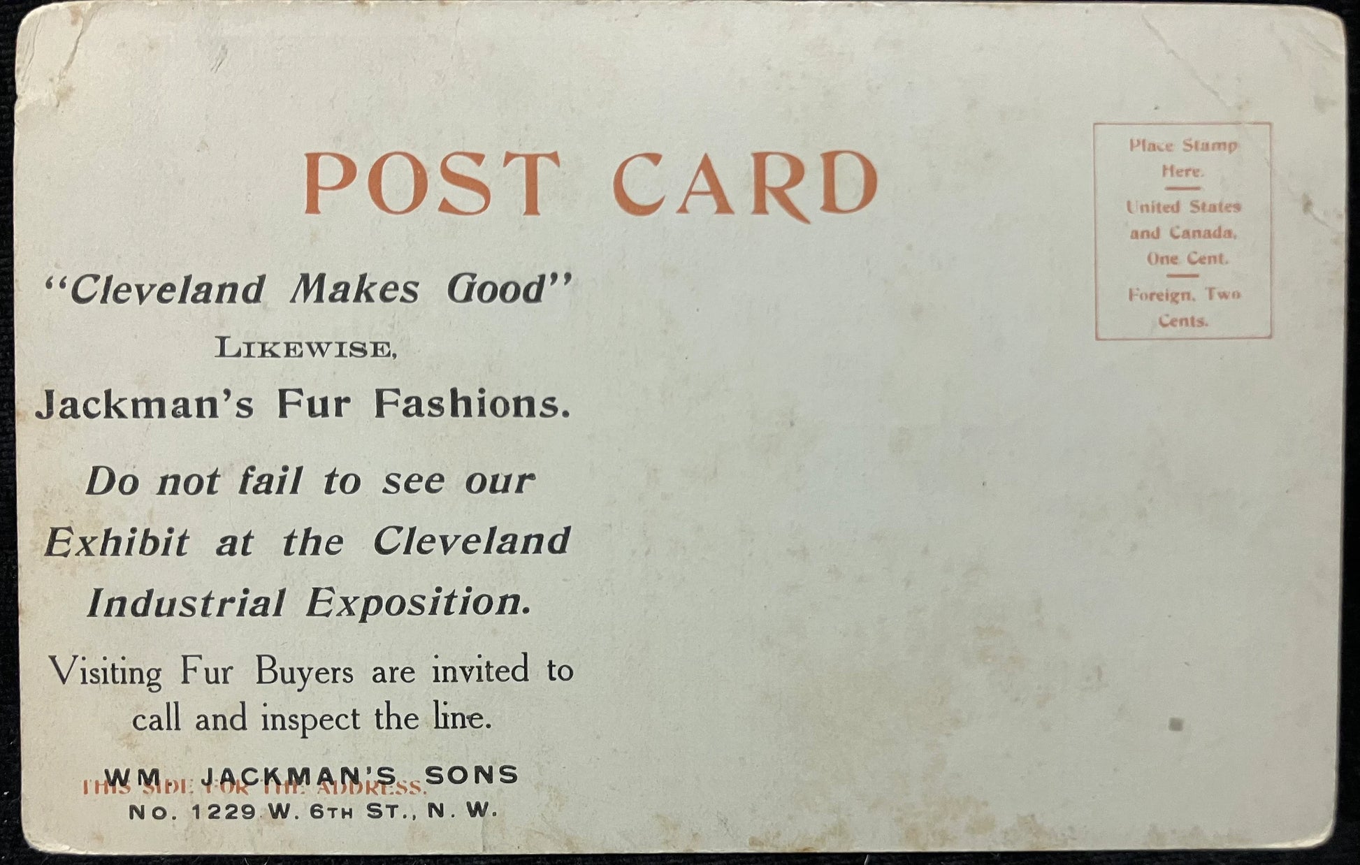 Back: “Cleveland Makes Good.” Likewise, Jackman’s Fur Fahsions. Do not fail to see our Exhibit at the Cleveland Industrial Exposition. Visiting Fur Buyers are invited to call and inspect the line. WM Jackman’s Sons