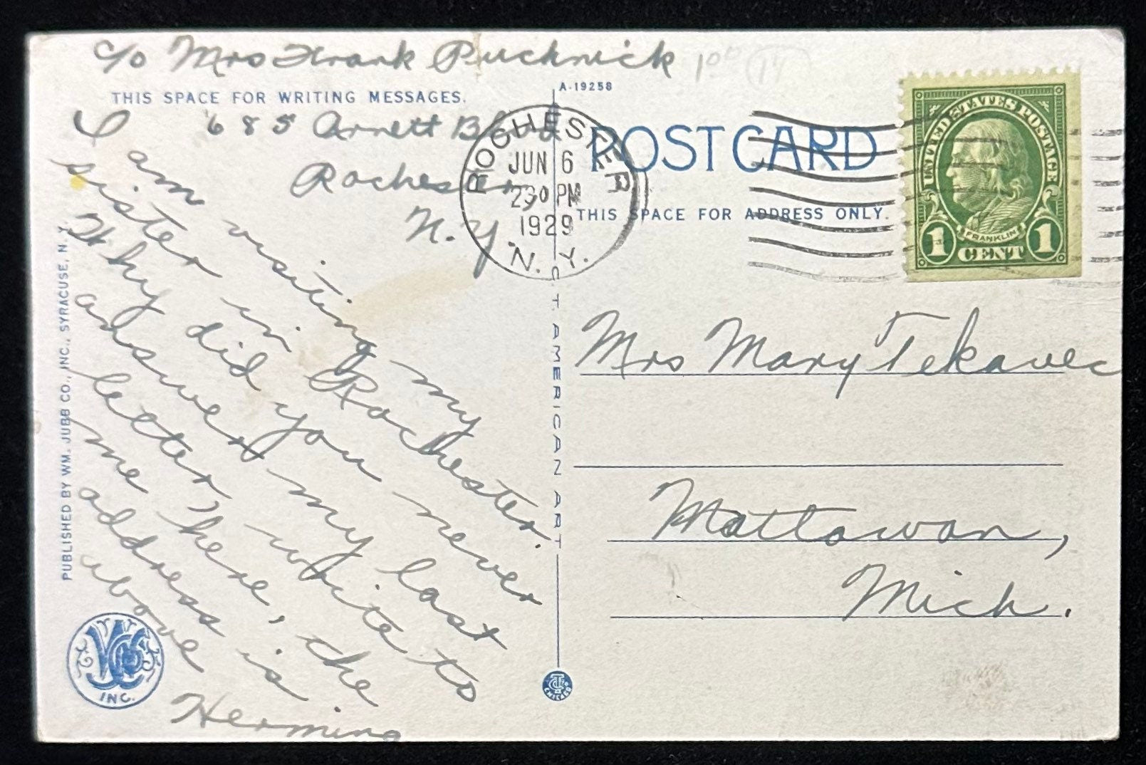 Mailed: Posted on June 6th, 1929 from Rochester, New York with a green 1 cent Benjamin Franklin stamp