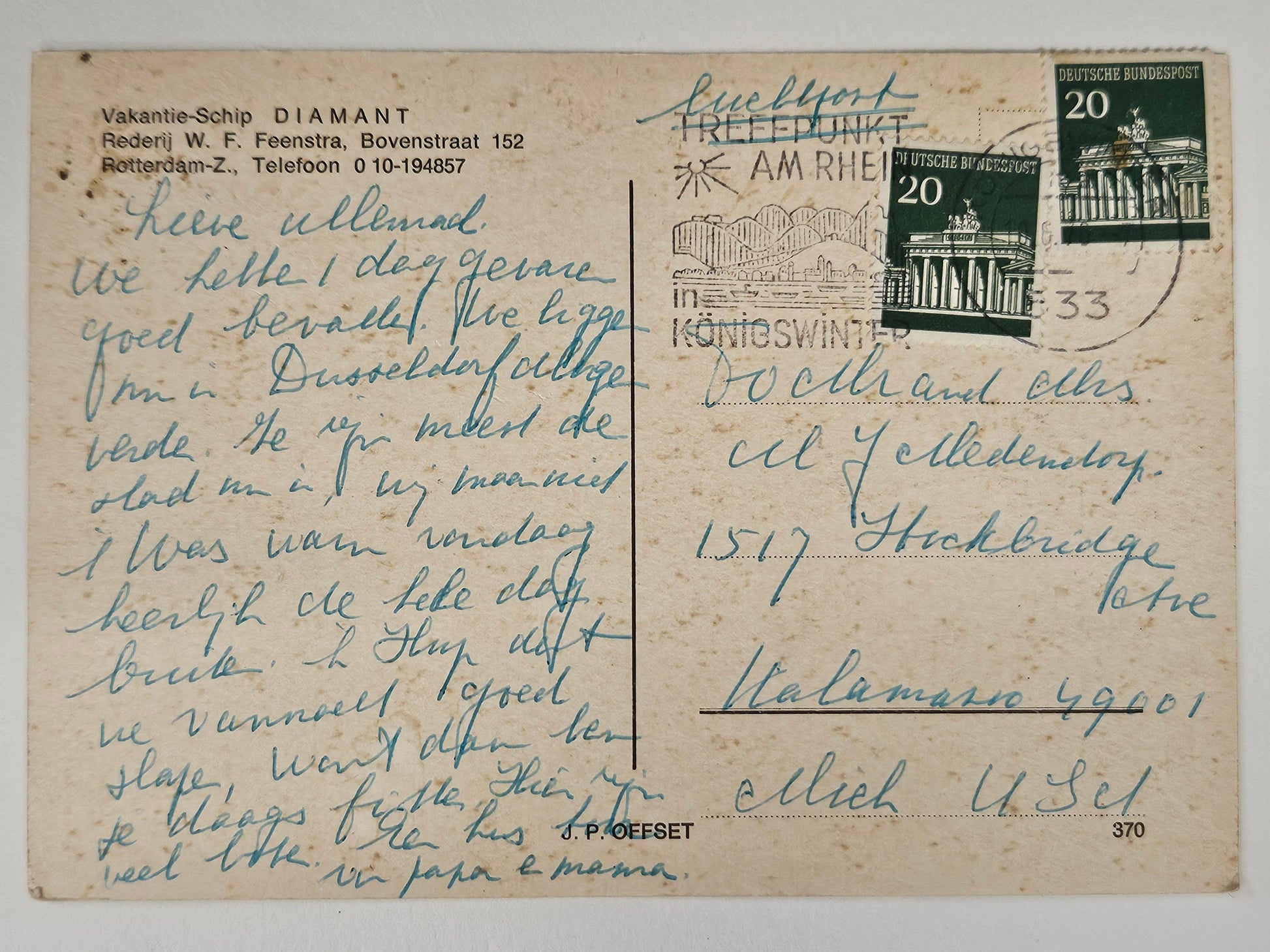 Back: Vakantie-Schip Diamant Rederik W.F. Feenstra, Bovenstraat 152 Rotterdam-Z., Telefon J.P. Offset