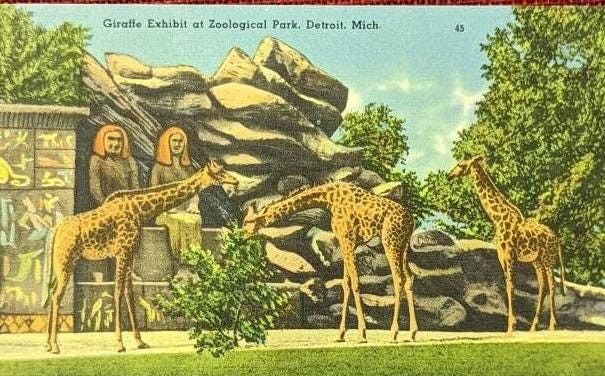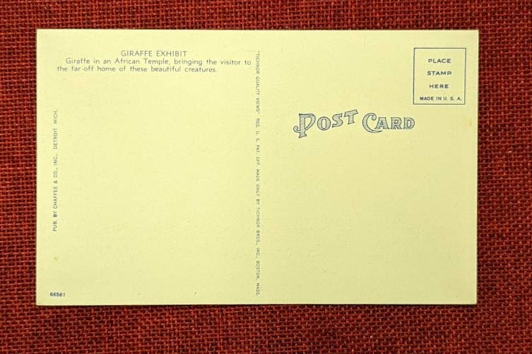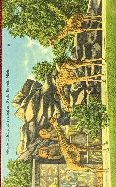Detroit zoo opened in 1927 and giraffes were introduced between 1930-1932. It is obvious from the photo, the zoo spent heavily to make extraordinary exhibits for the animals. Detroit was in a hey day, and donors to the zoo were probably ready with cash infusions. linen card in great condition. never mailed.