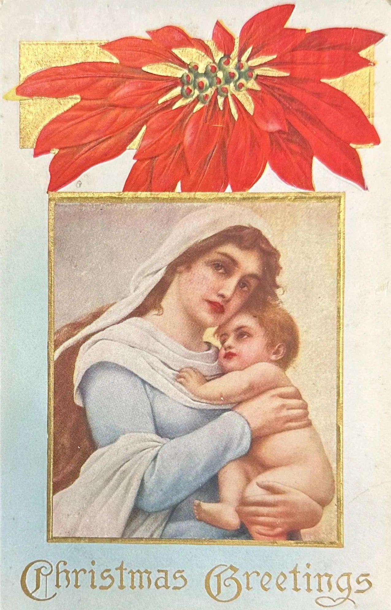 Gold Foiled Poinsettia and Illustrated Madonna and Child - Christmas Greetings - Embossed Vintage Postcard 1914