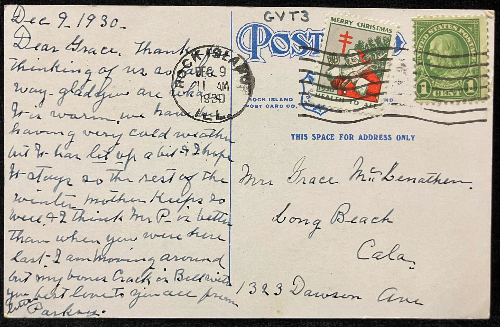 Mailed: Postmark 1930 Merry Christmas 1930 Health to All stamp and a green one cent Benjamin Franklin stamp