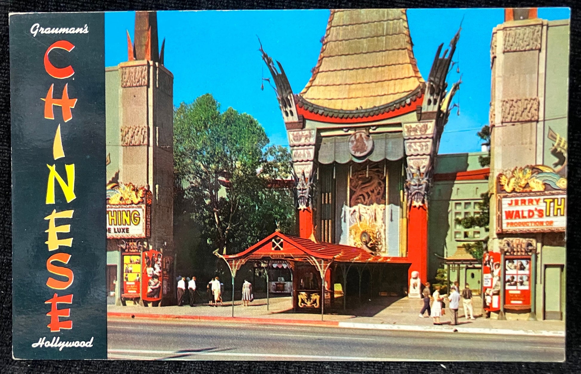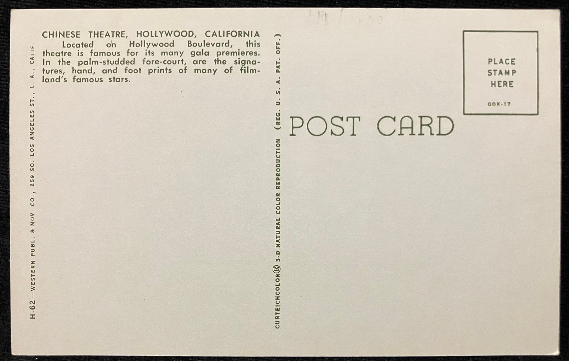 On back: Chinese Theatre, Hollywood, California. Located on Hollywood Boulevard, this theatre is famous for its many gala premiers. In the palm-studded fore-court, are the signatures, hand, and foot prints of many of filmland’s famous stars.