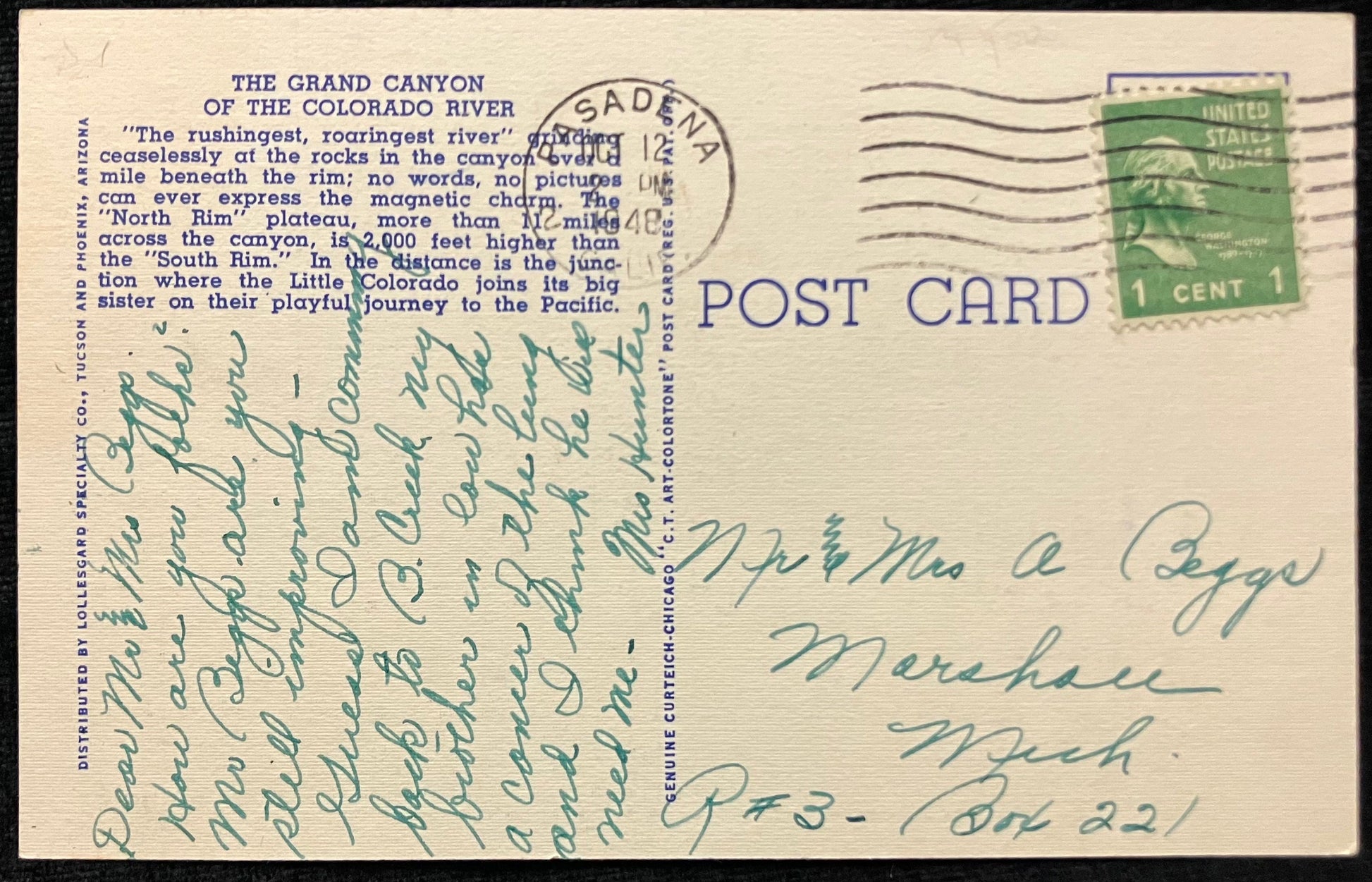 Card 2 mailed: Postmark on October 12, 1948 from Pasadena, California with a green one cent George Washington stamp