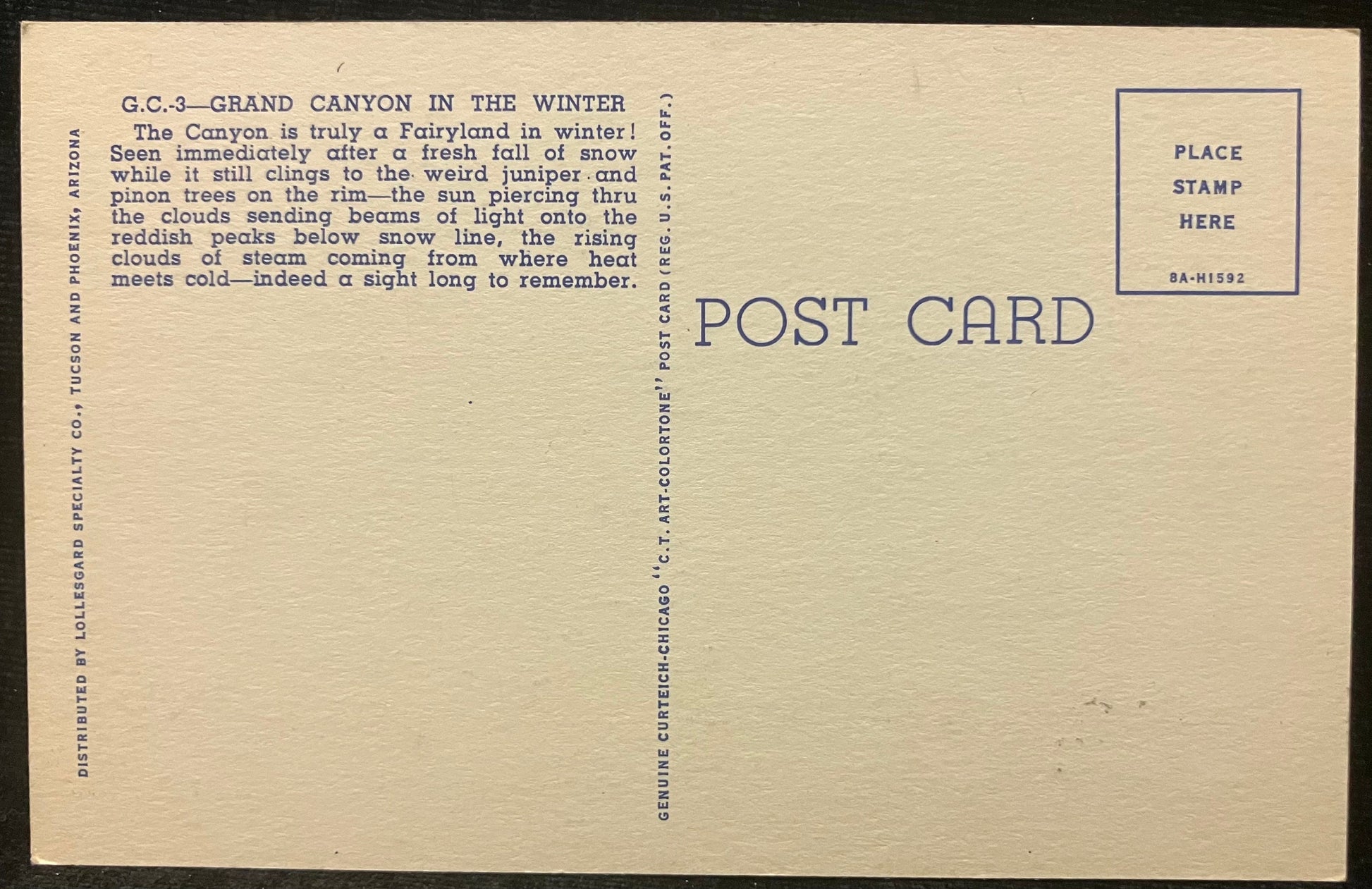 On back: Grand Canyon in the Winter. The Canyon is truly a Fairyland in the winter! Seen immediately after a fresh fall of snow while it still clings to the weird juniper and the clouds sending beans of light onto the reddish peaks below snow line, the raising clouds of steam coming from where heat meets cold - indeed a sight long to remember