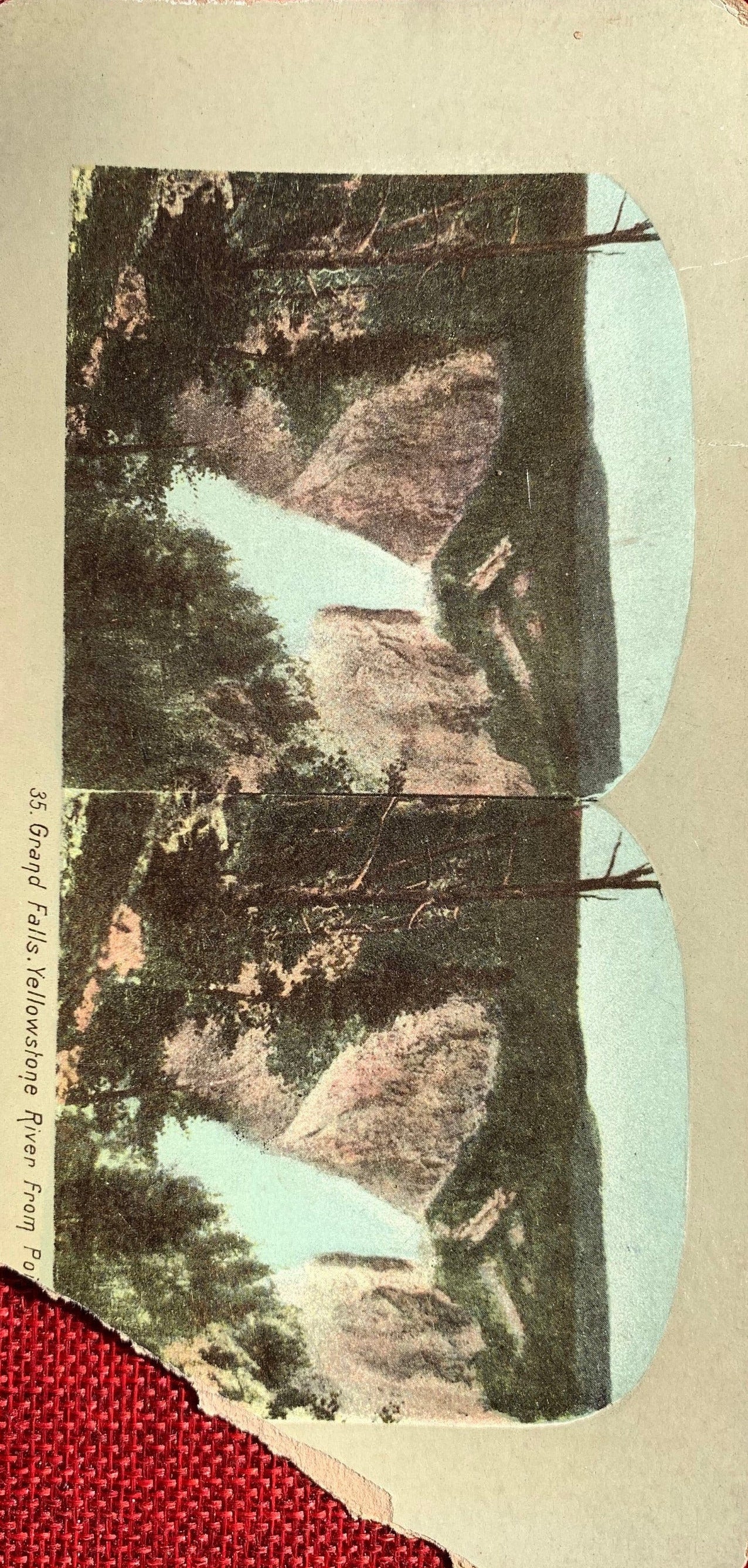 This vintage stereo view card features two hand tinted photographs of the Grand Falls of the Yellowstone River. As depicted in the photo, the stereo card is torn and missing the bottom right corner.