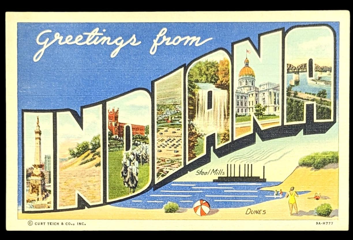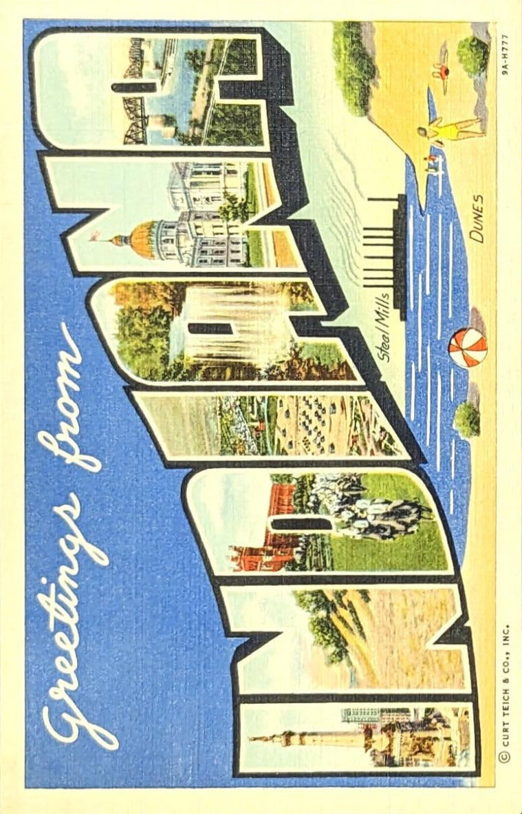 This is a bright and fun design from a vintage Indiana postcard showing different parts of the state in the letters and feturing the dunes and steel mills at the bottom. The print can be used for an assortment of things such as printing it on a mug, t-shirt, poster or cards to send.