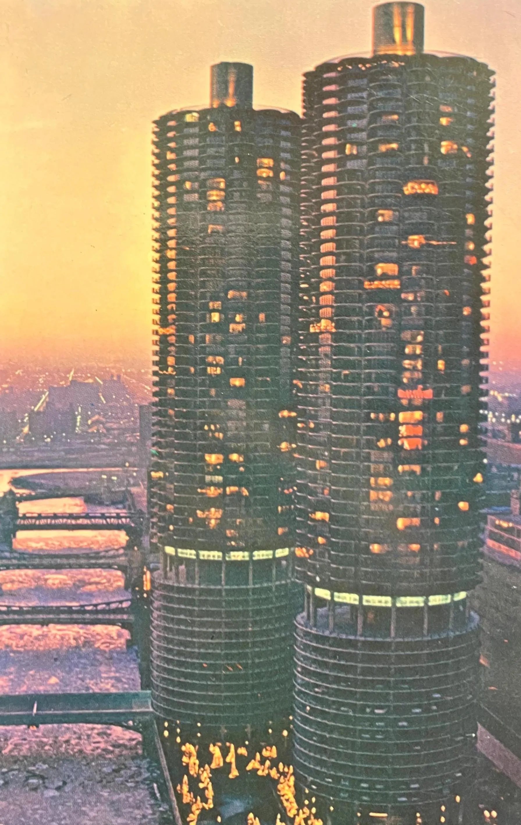 Back: GREETINGS FROM CHICAGO Night view of famed MARINA CITY, looking west on the Chicago River from vicinity of Michigan Avenue Bridge.