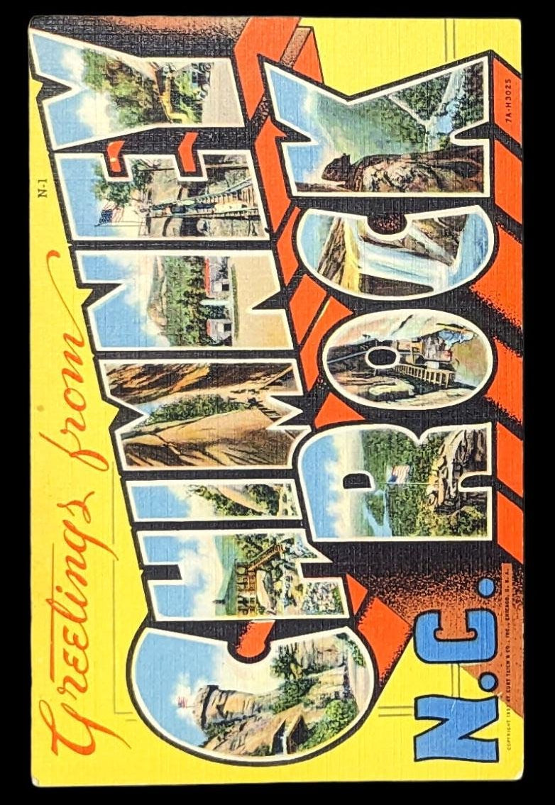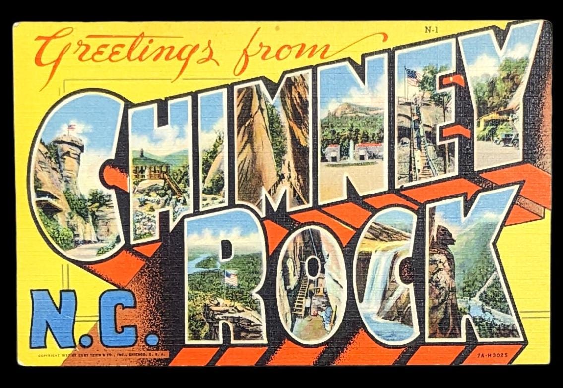 This is a bright and fun design from a vintage Chimney Rock, North Carolina postcard. The print can be used for an assortment of things such as printing it on a mug, t-shirt, poster or cards to send.