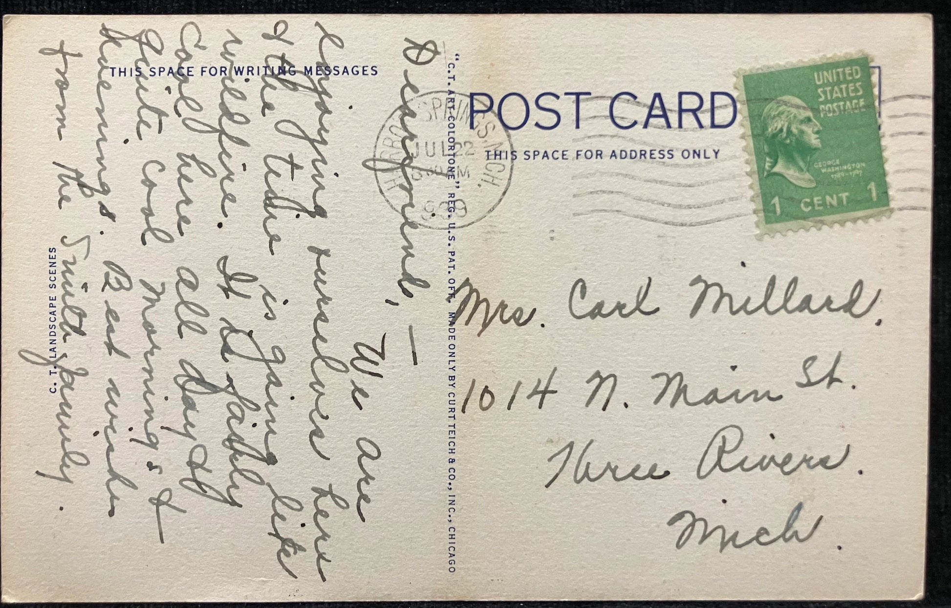 Mailed: Postmark: 1939 Harbor Springs MICH. Green one cent George Washington stamp