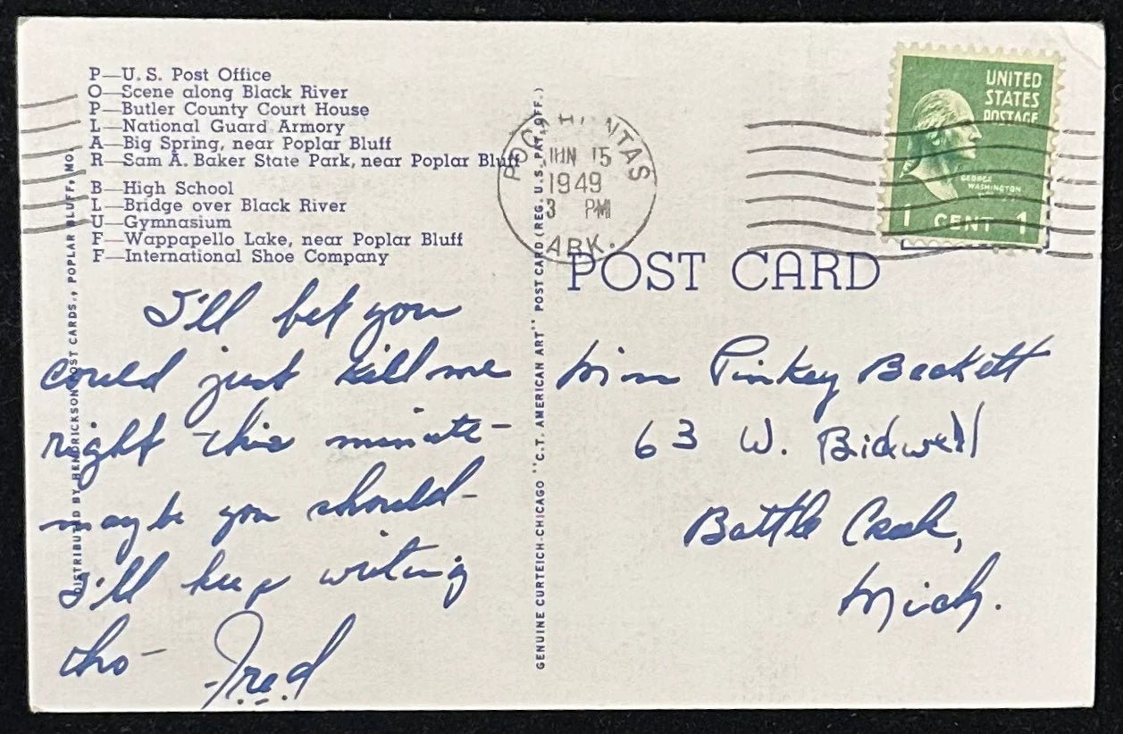 Mailed: Posted on June 15th, 1949, with a green 1-cent George Washington stamp