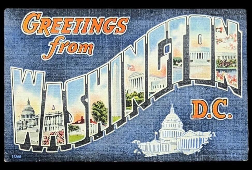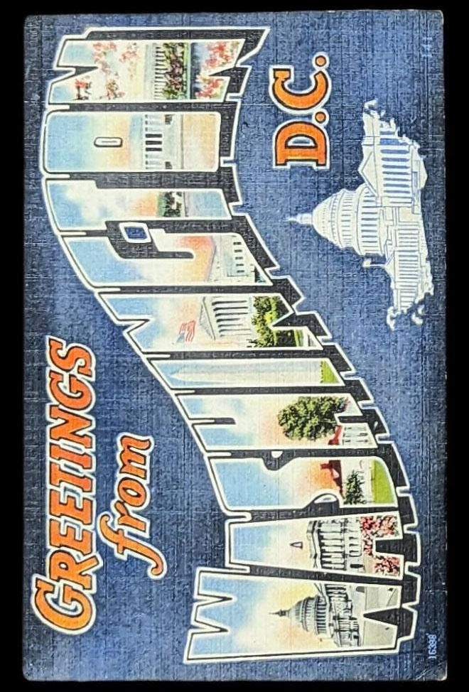 This is a bright and fun design from a vintage Greetings from Washington D.C. Block letter postcard. The print can be used for an assortment of thing such a printing it on a mug, t-shirt, poster or cards to send.