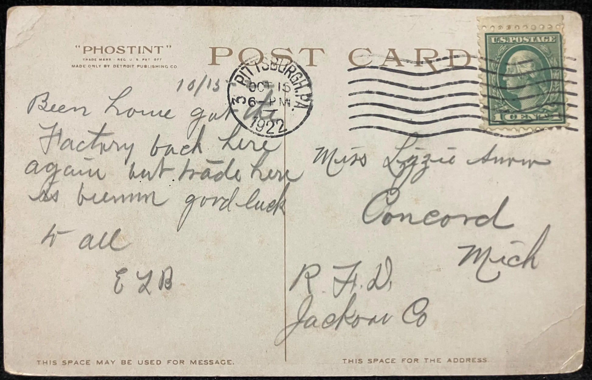 Mailed: Postmark: 1922 green one cent George Washington stamp