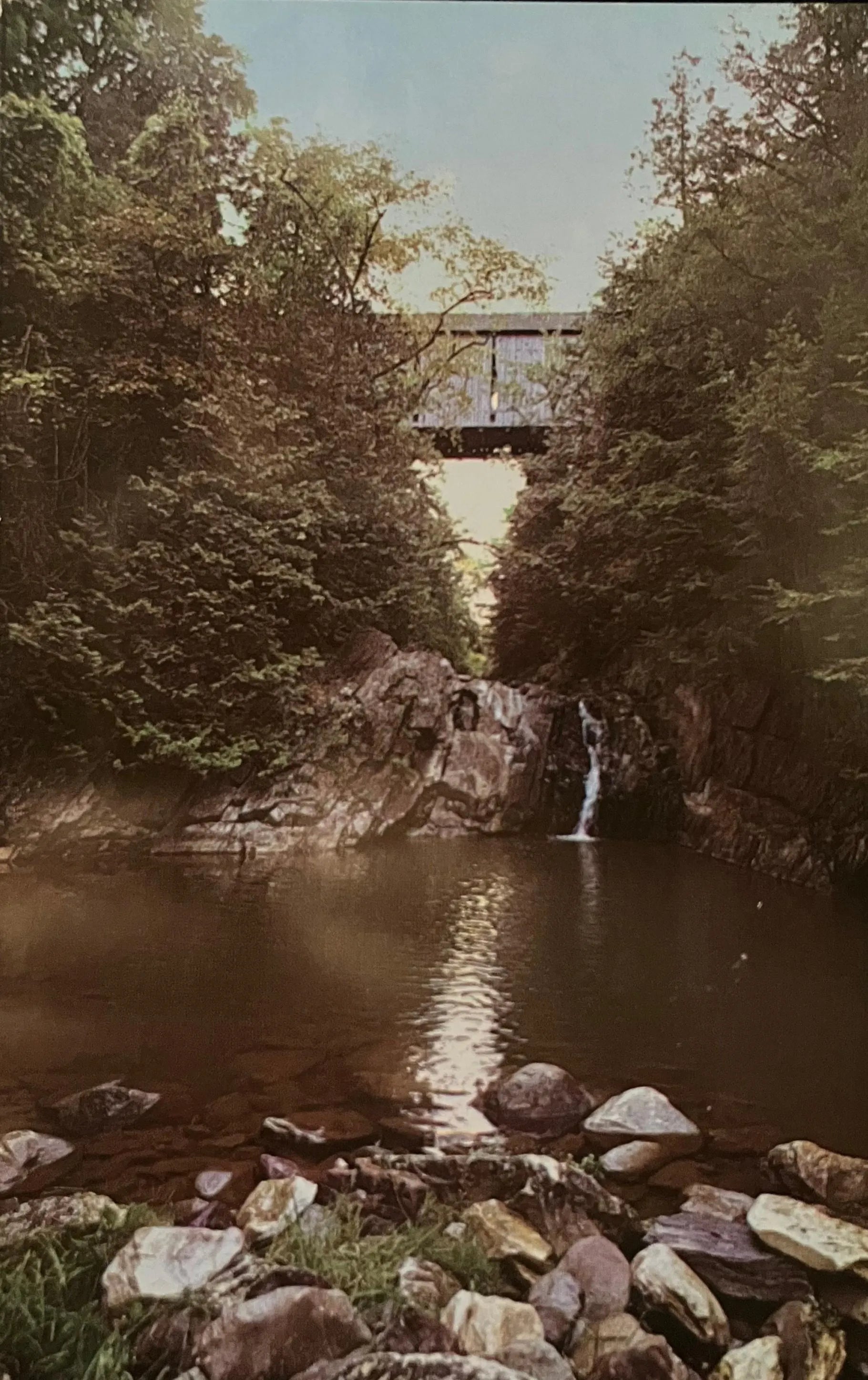 Back: Swimming hole under an Old Covered Bridge settling, known as the Halpin Bridge, Middlebury, Vermont.