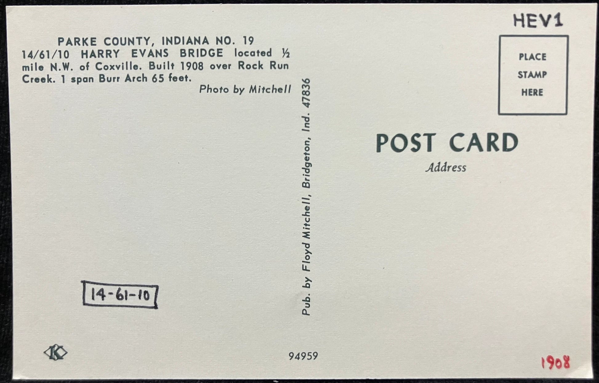 Back: PARKE COUNTY, INDIANA NO. 19 14/61/10 HARRY EVANS BRIDGE located 1/2 mile N.W. of Coxville. Built 1908 over Rock Run Creek. 1 span BUrr Arch 65 feet.
