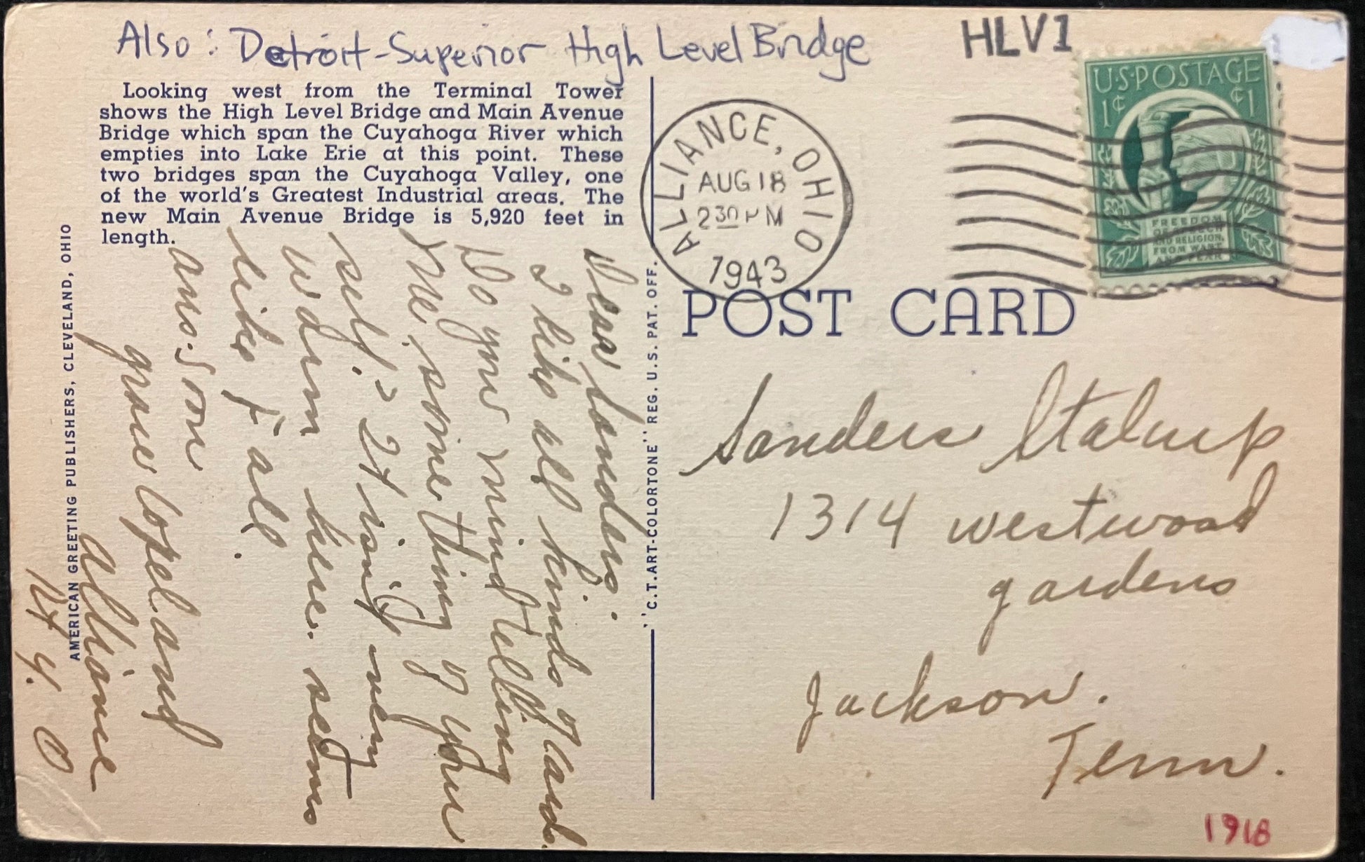 Mailed: Postmark on August 18, 1943 from Alliance, Ohio witha. green one cent Lady Liberty stamp that state the Four Freedoms (Speech, Religion, Want, and Fear)