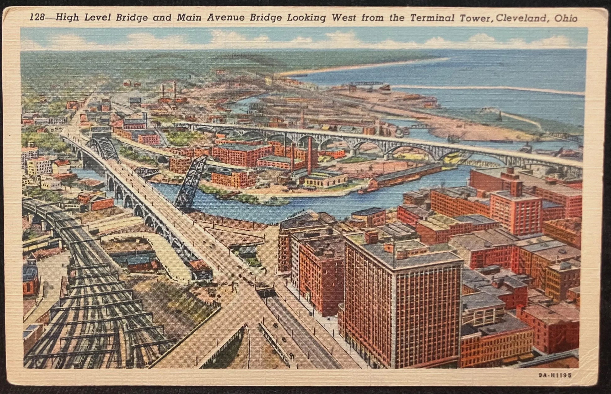 Back: Looking west from the Terminal Tower shows teh HIgh Level bridge and Main Evenue Bridge which span the Cuyahoga River which empties into Lake Erie at this point. These two bridges span the Cuyahoga Valley, one of the world’s Greatest Industrial areas. The new Main Avenue BRidge is 5,920 feet in length.