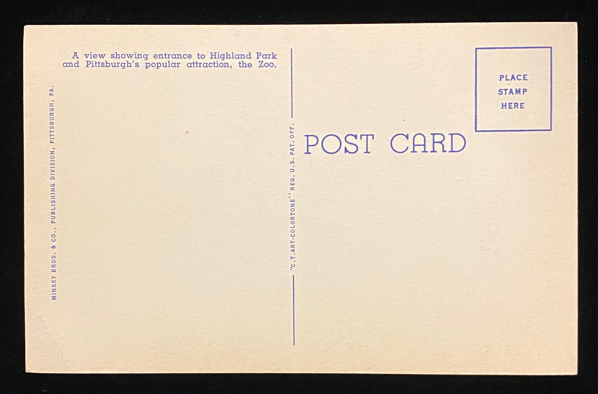 Back Information: "A view showing entrance to Highland Park and Pittsburgh's popular attraction, the Zoo."