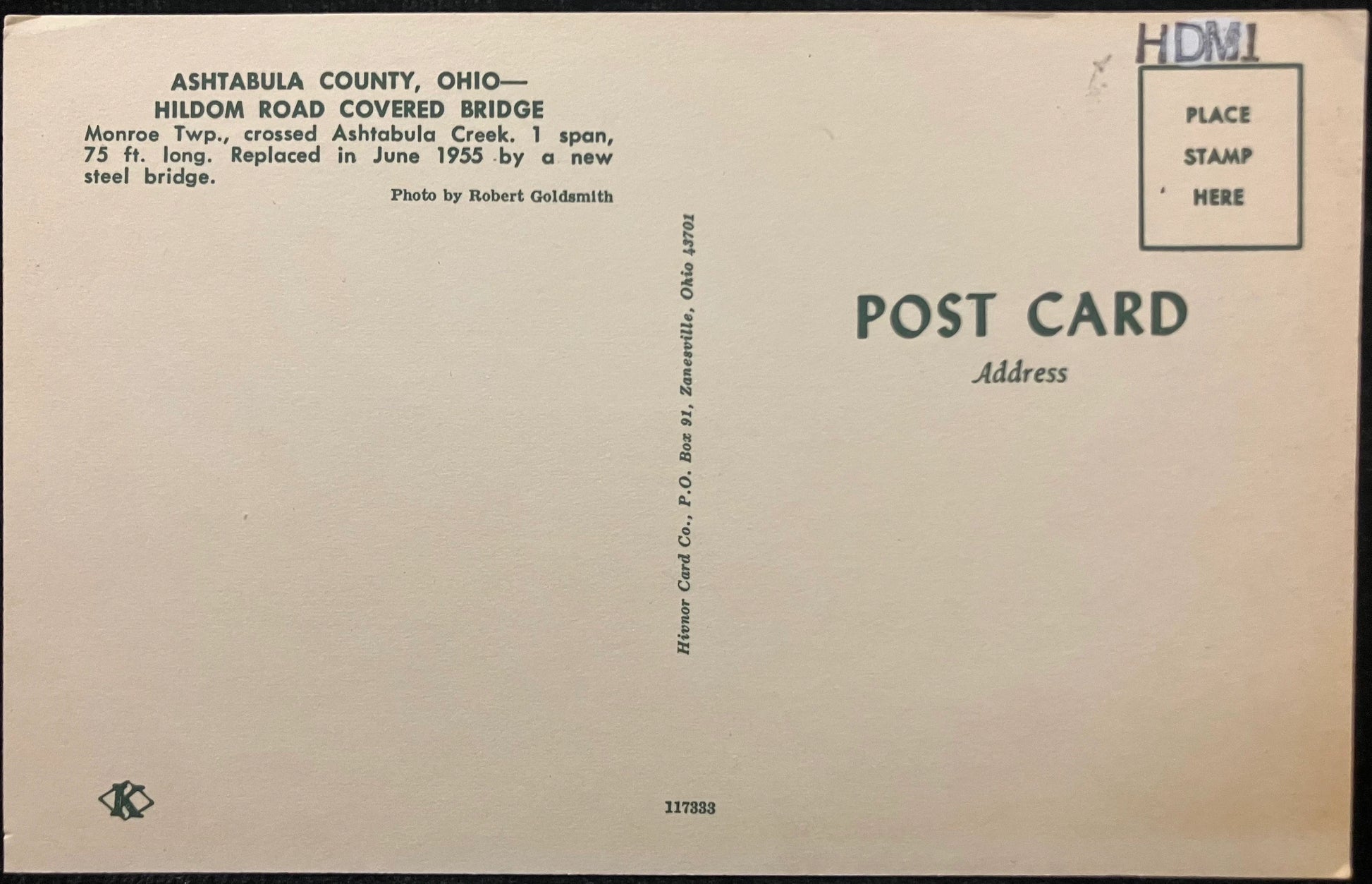 On front: A photo of Hildom Road Covered Bridge in Ashtabula County, Ohio