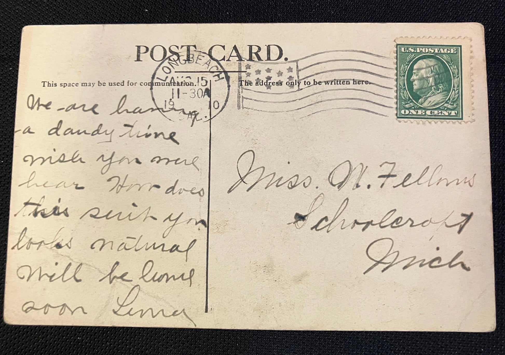 Mailed: Posting date, August 15, 1910, Long Beach, C.A. a green 1-cent George Washington stamp
