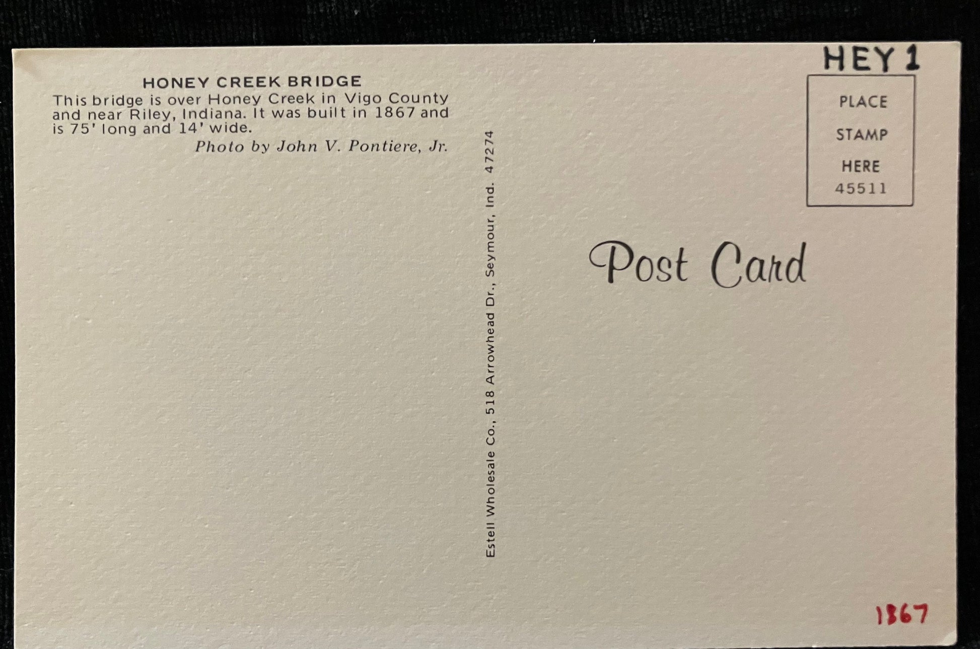 back: Honey Creek Bridge This bridge is over Honey Creek in Vigo County and near Riley, Indiana. It was built in 1867 and is 75’ long and 14’ wide.
