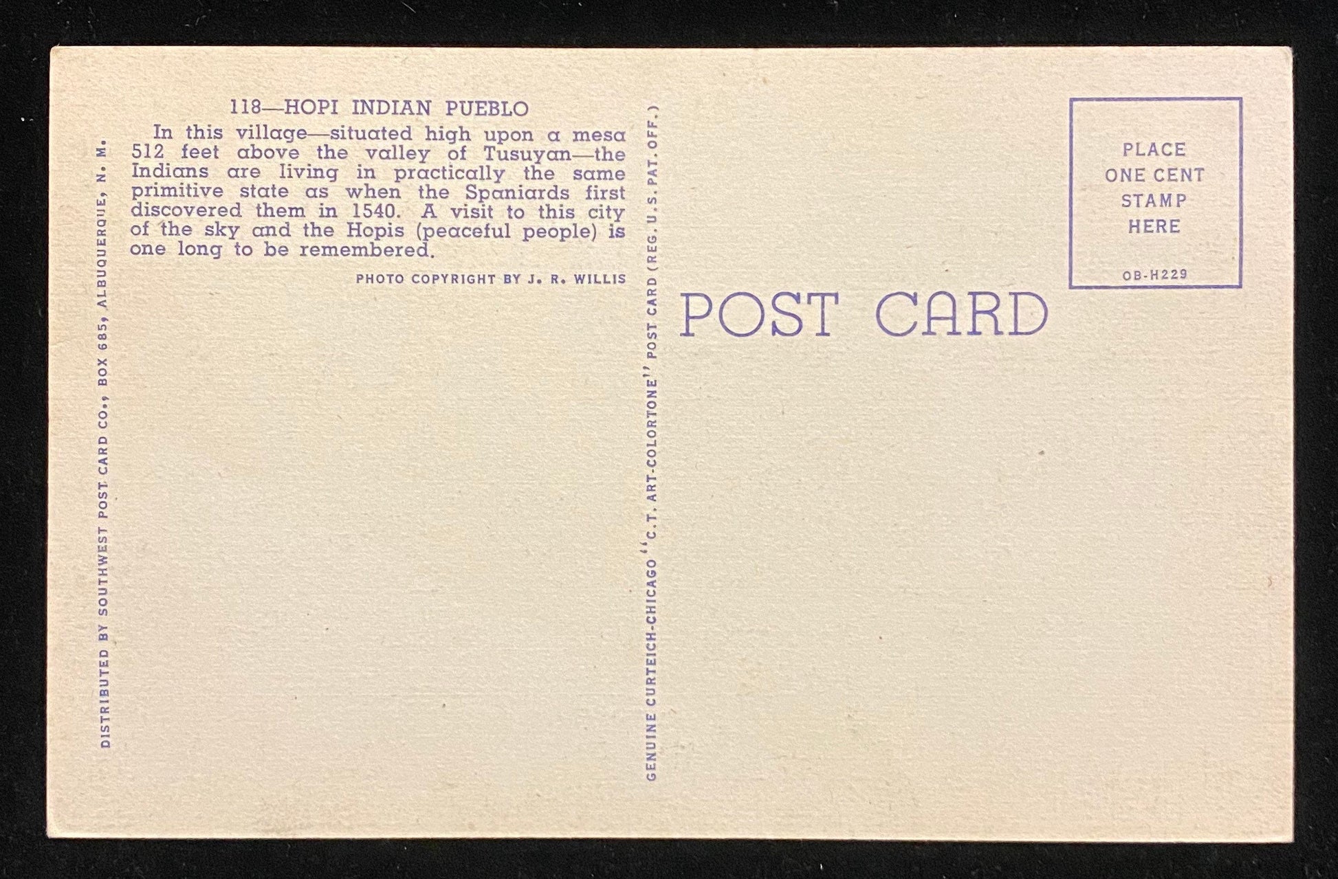 Back Information: "In this village - situated high upon a mesa 512 feet above the valley of Tusuyan - the Indians are living in practically the same primitive state as when the Spaniards first discovered them in 1540. A visit to this city of the sky and the Hopis (a peaceful people) is one long to be remembered."