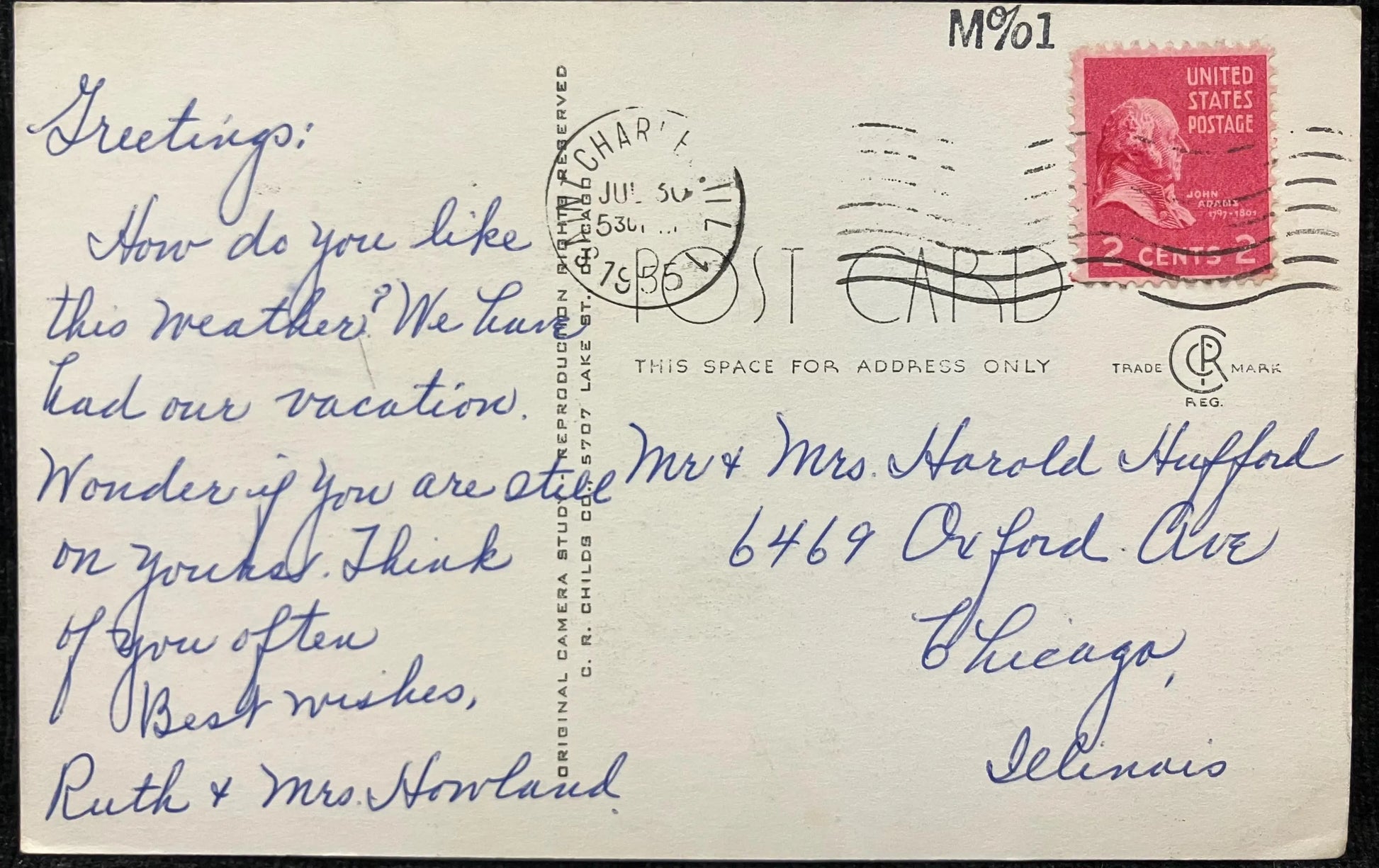 Postmarked in 1955 with a red two-cent John Adams stamp