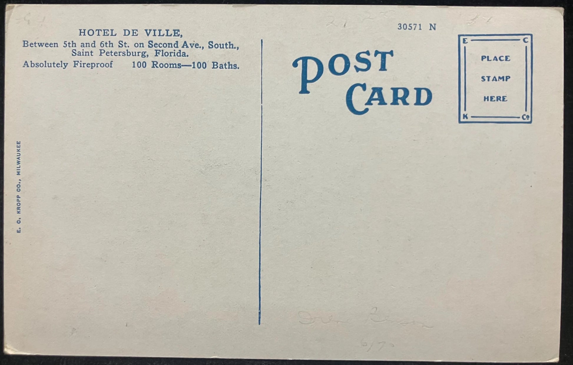 Hotel De Ville, Saint Petersburg, Florida - Vintage Hotel Postcard