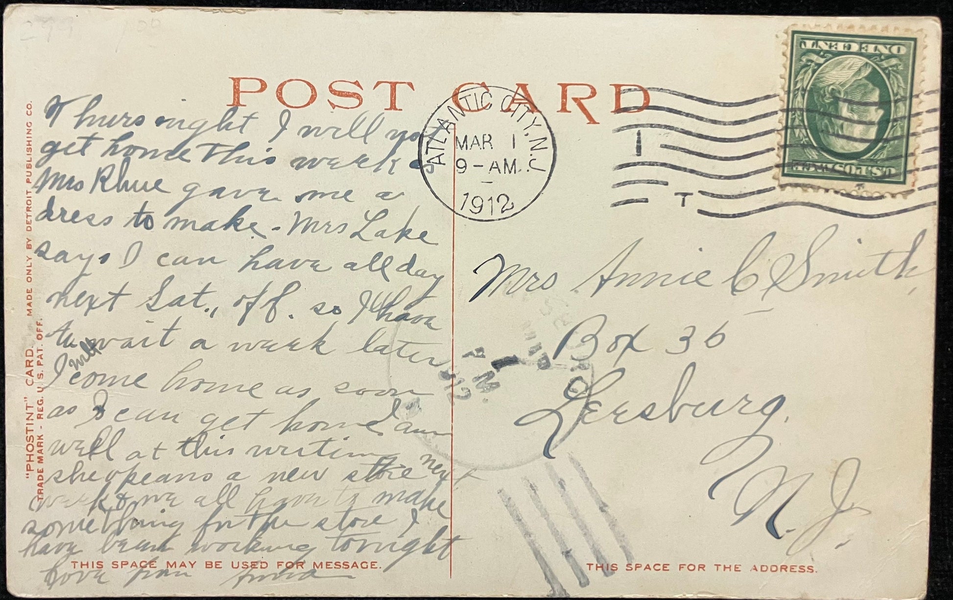 Mailed: Postmark from Atlantic Cit, N. J. in 1912 with a green one cent Benjamin Franklin upside down.