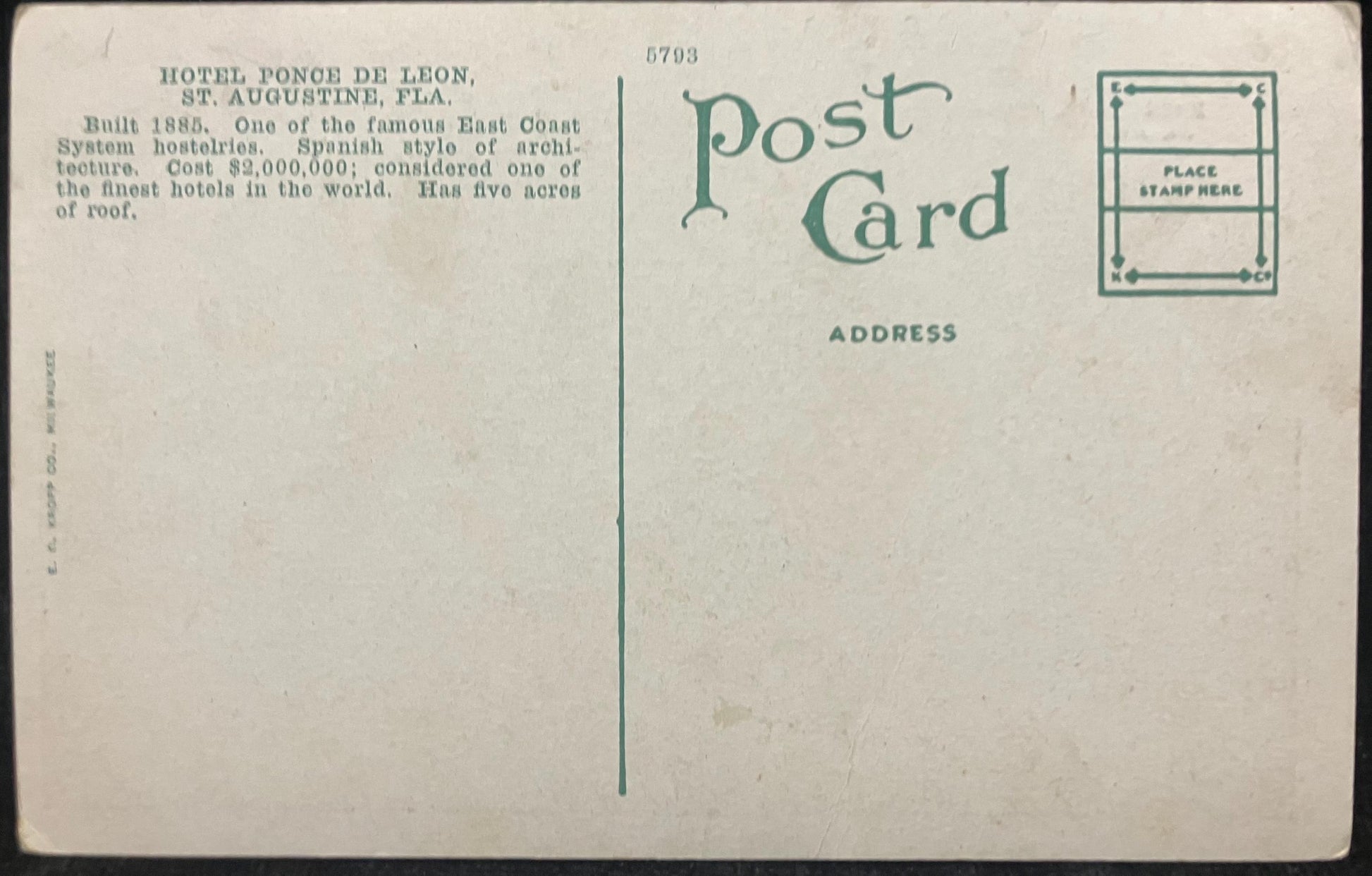 Back: HOTEL PONCE DE LEON, ST. AUGUSTINE, FLA. Built 1885. One of the famous East Coast System hostelries. Spanish style of architecture. Cost $2,000,000; considered one fo the finest hotels in the world. Has five acres of roof.