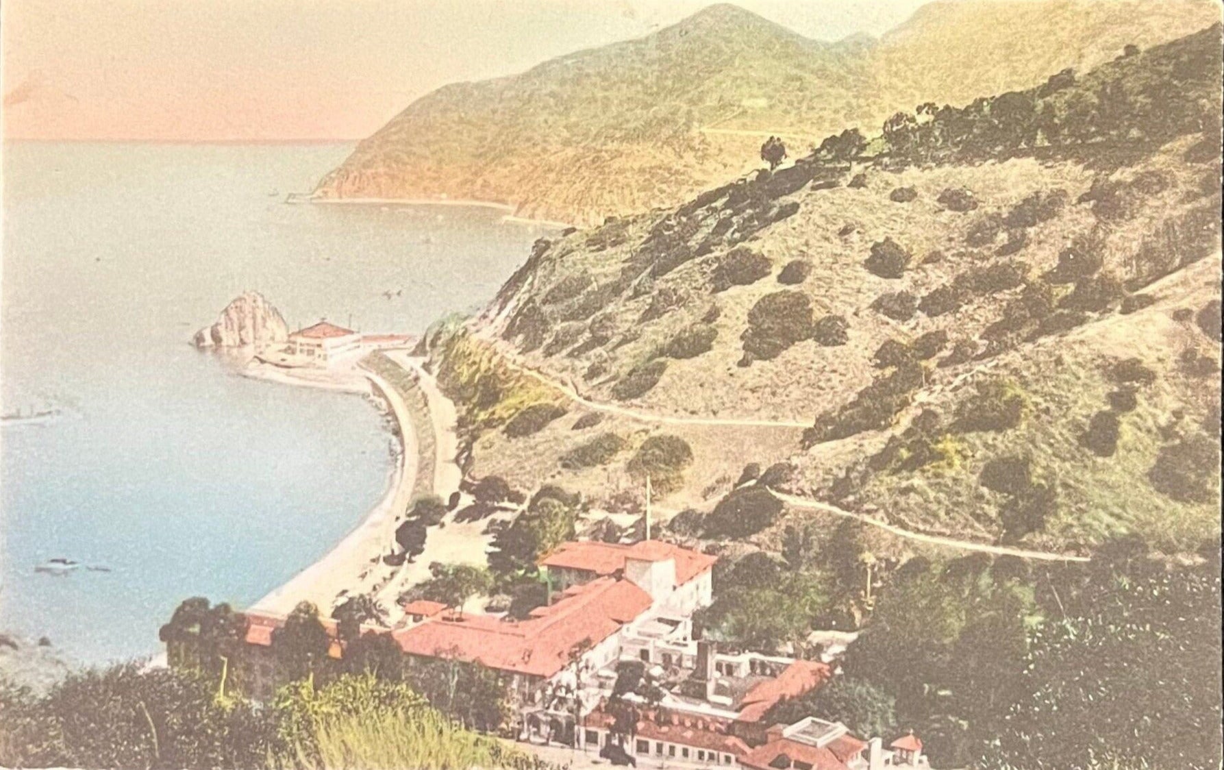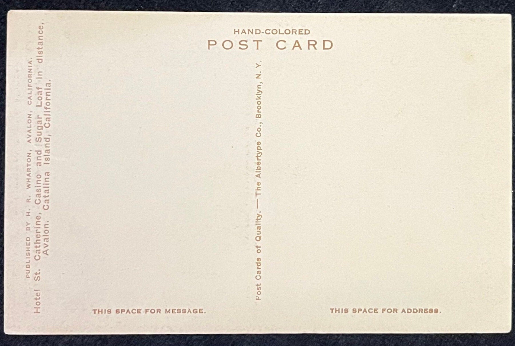 Front: A photo of Hotel St. Catherine, with Casino and Sugar Loaf in the distance, Catalina Island, California.