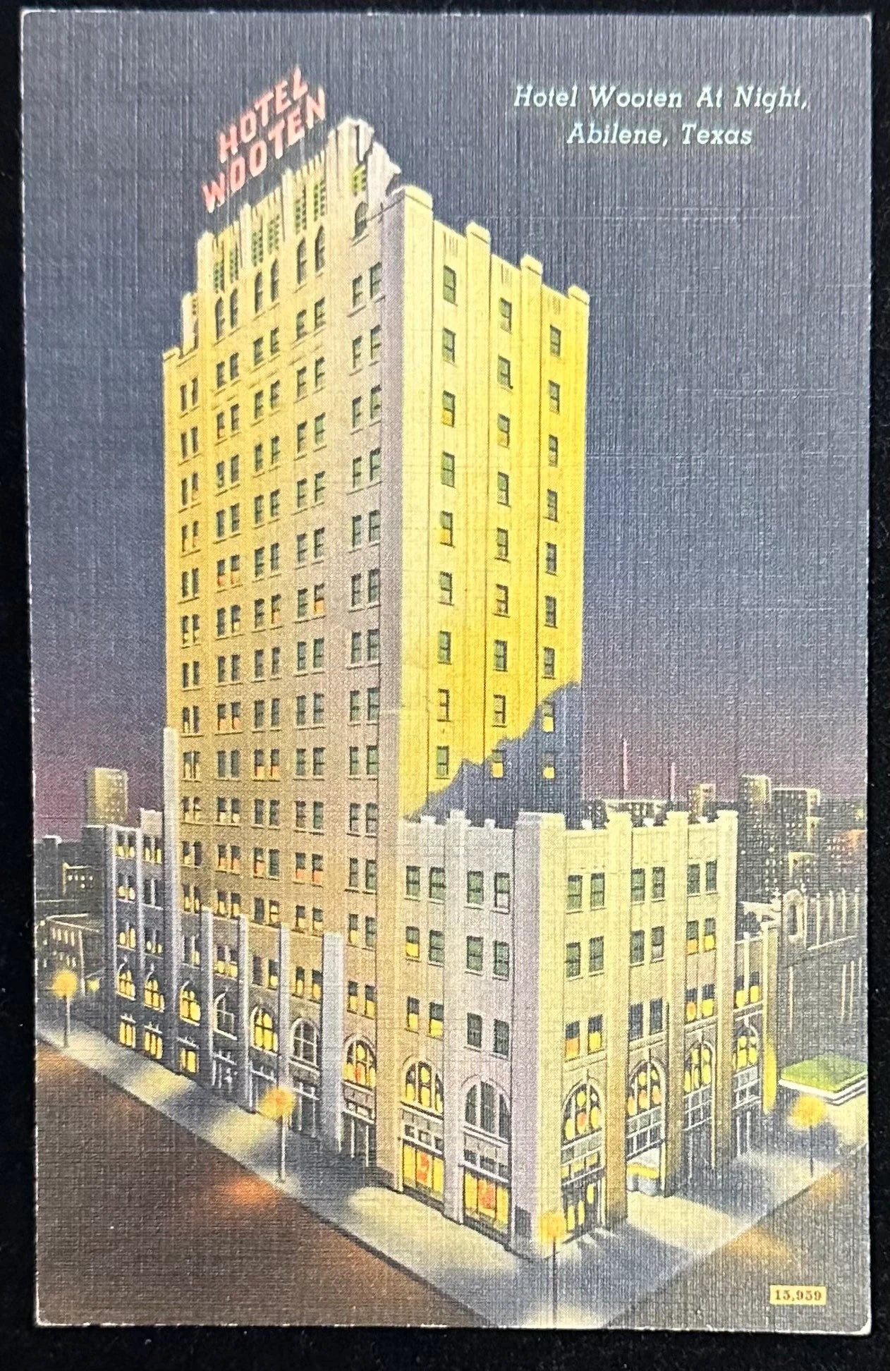 Hotel Wooten At Night, Abilene, Texas - Linen Vintage Postcard