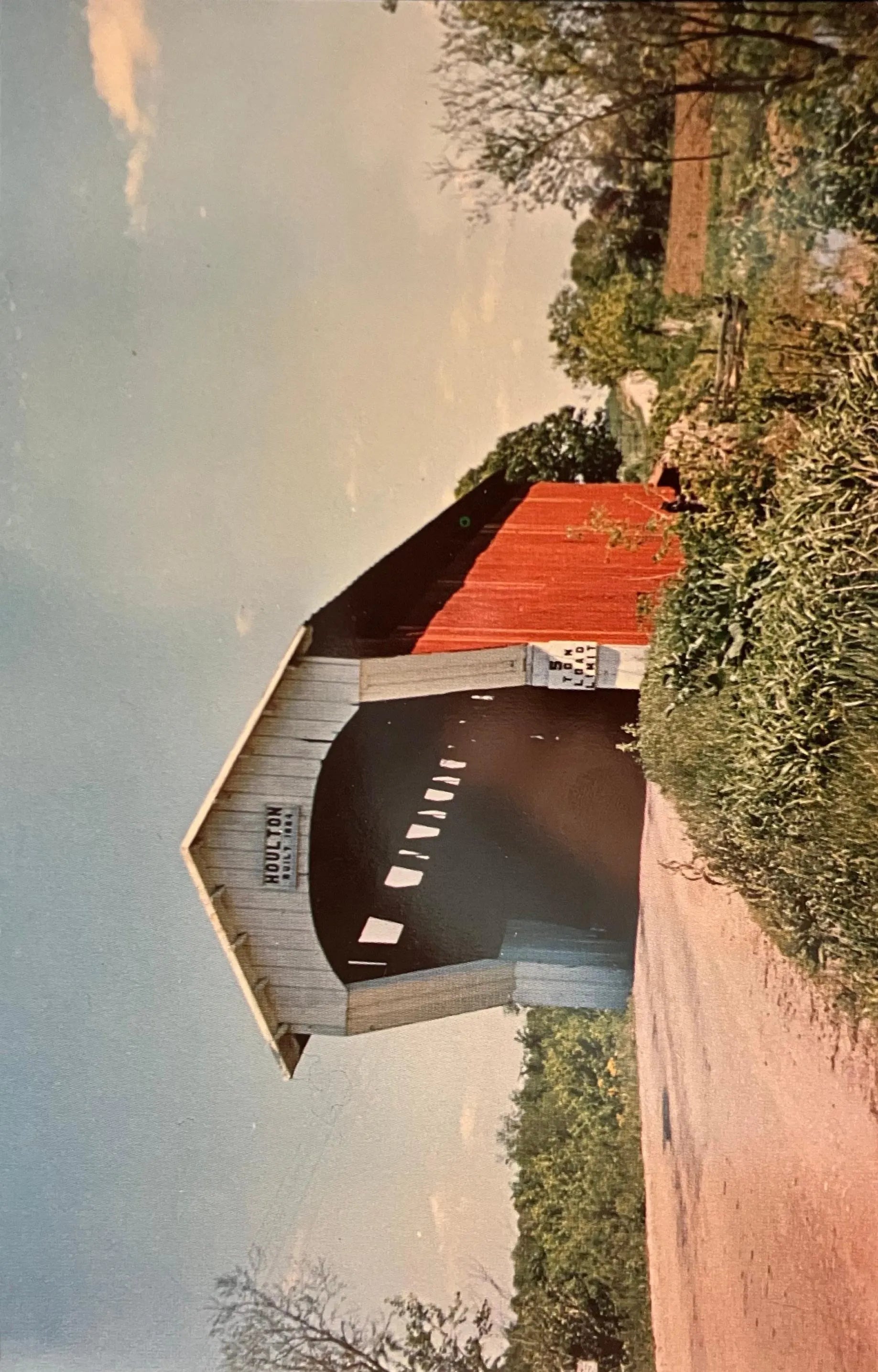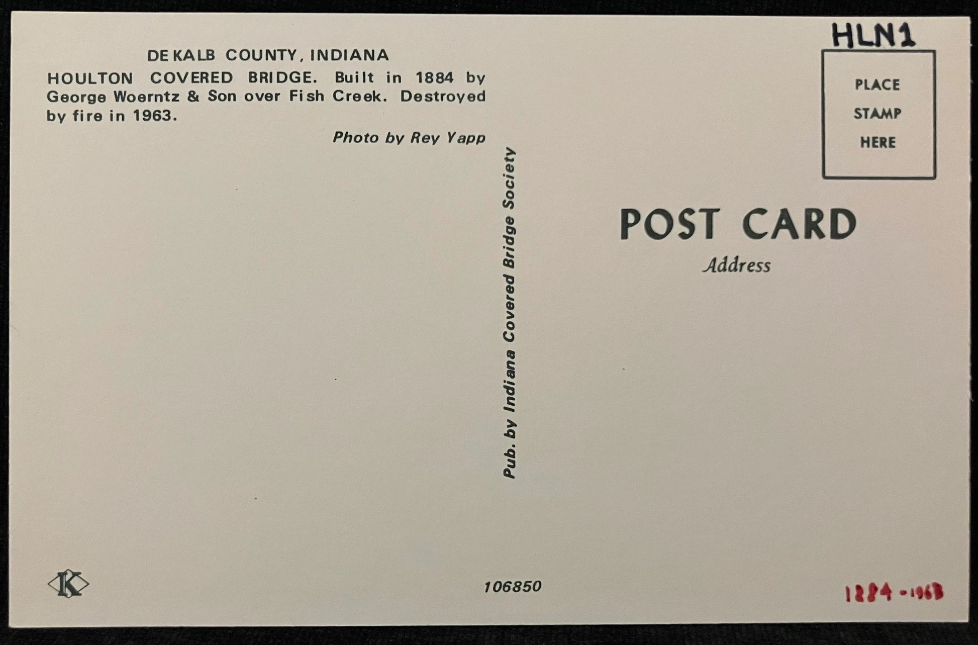 On back: DE KALB COUNTY, INDIANA Houlton COVERED BRIDGE. Built in 1884 by George Woerntz & Son over Fish Creek. Destroyed by fire in 1963.