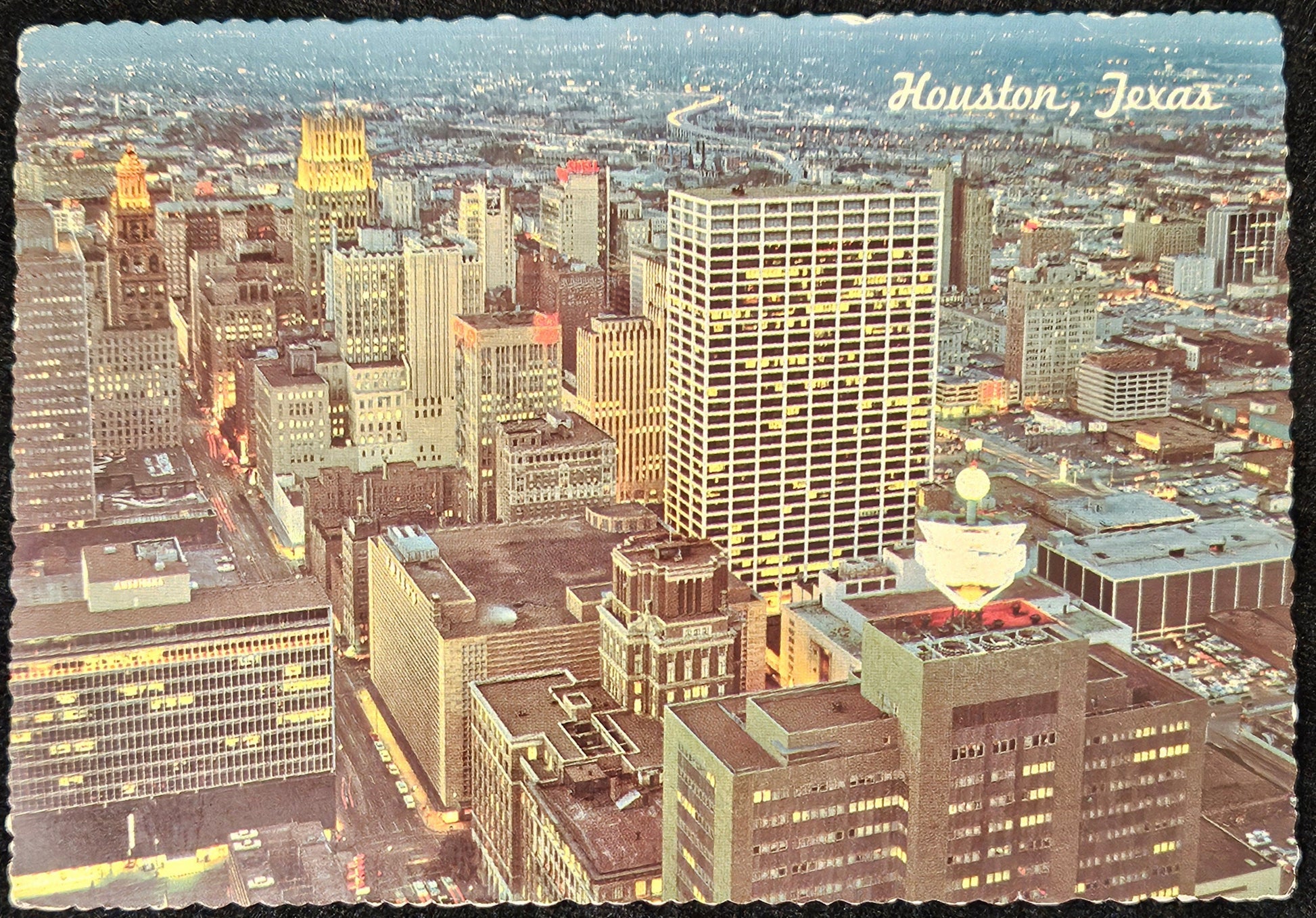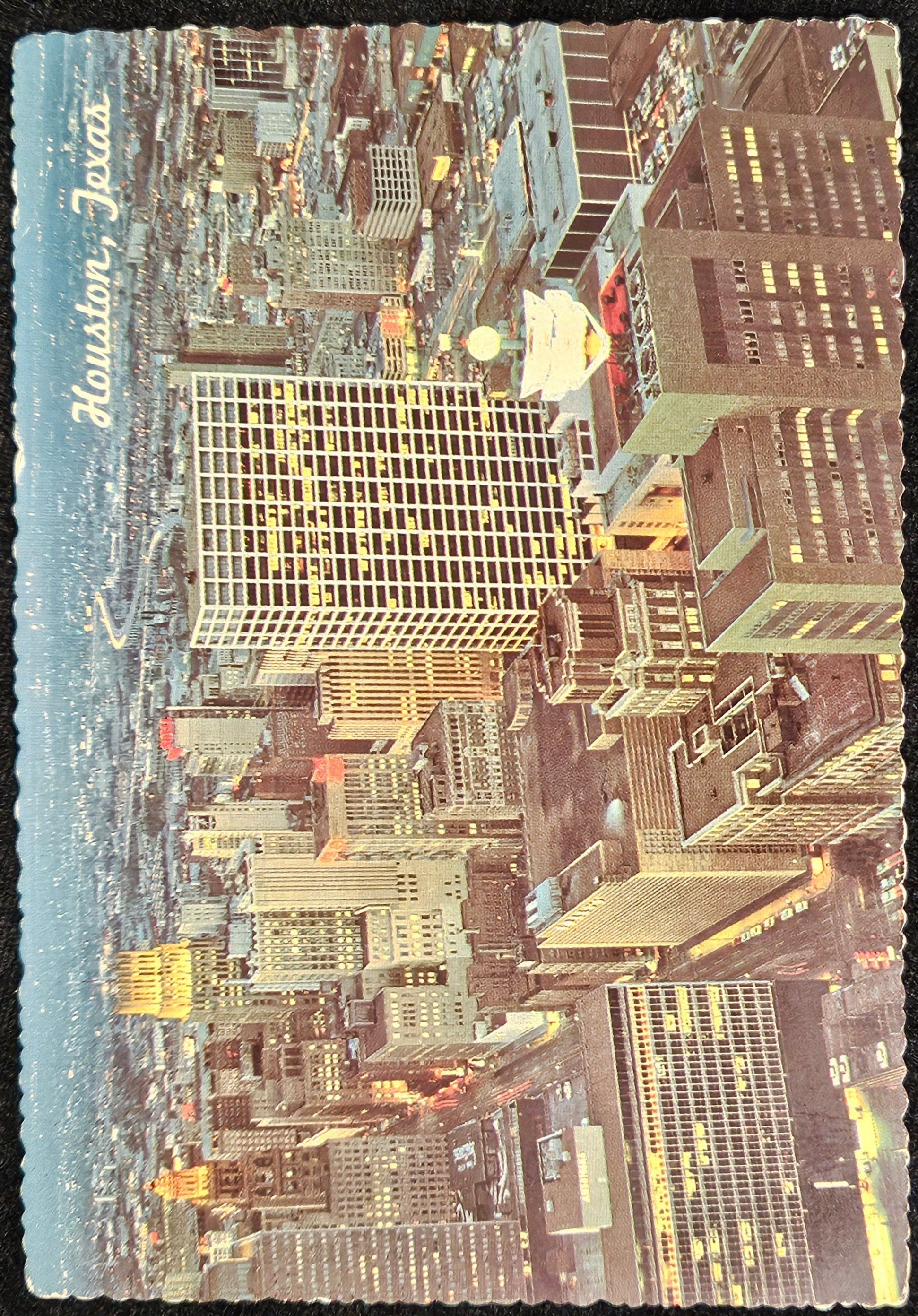 Houston Texas Skyline At Night - 1970s Aerial Color Photo Postcard