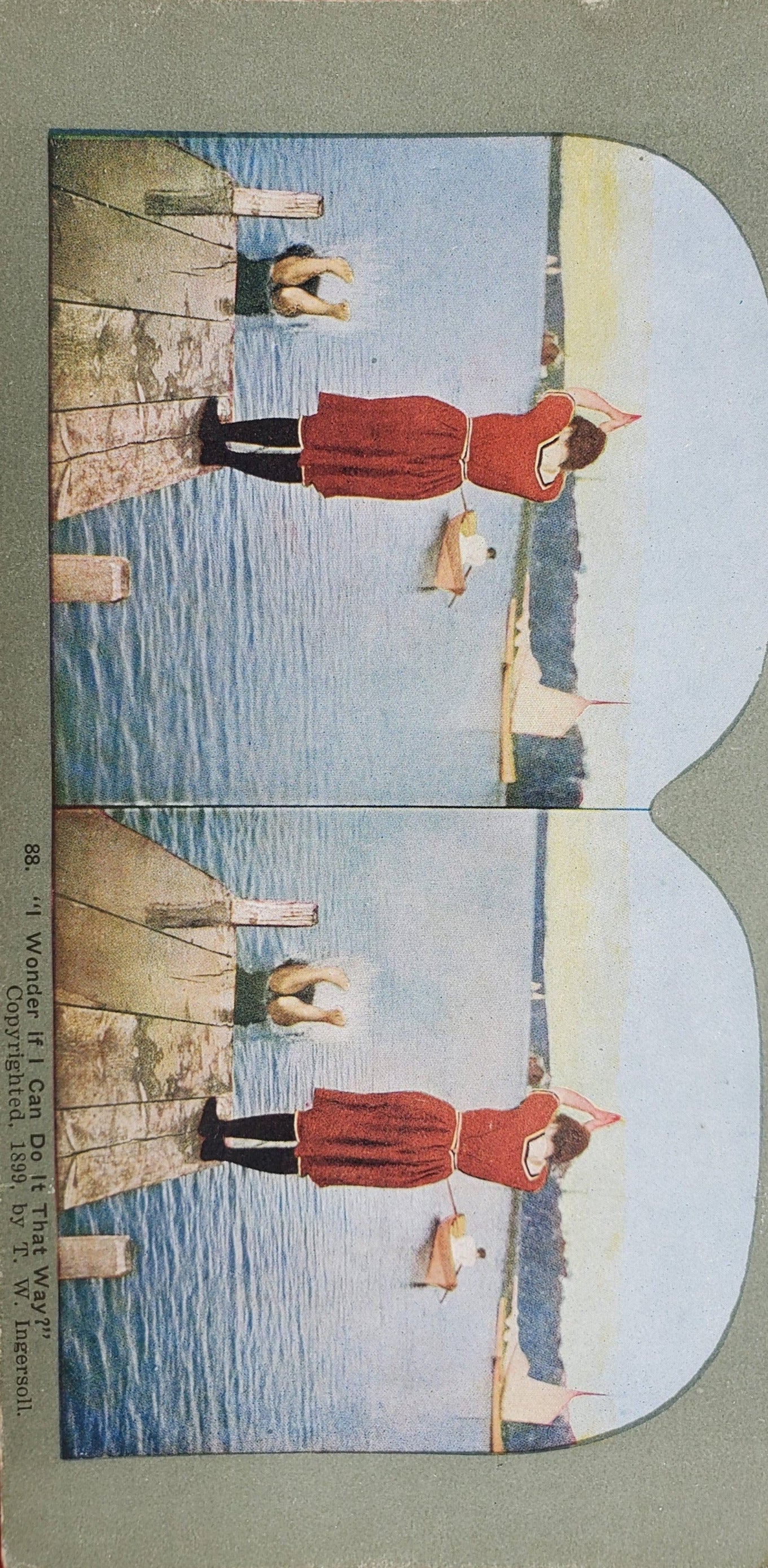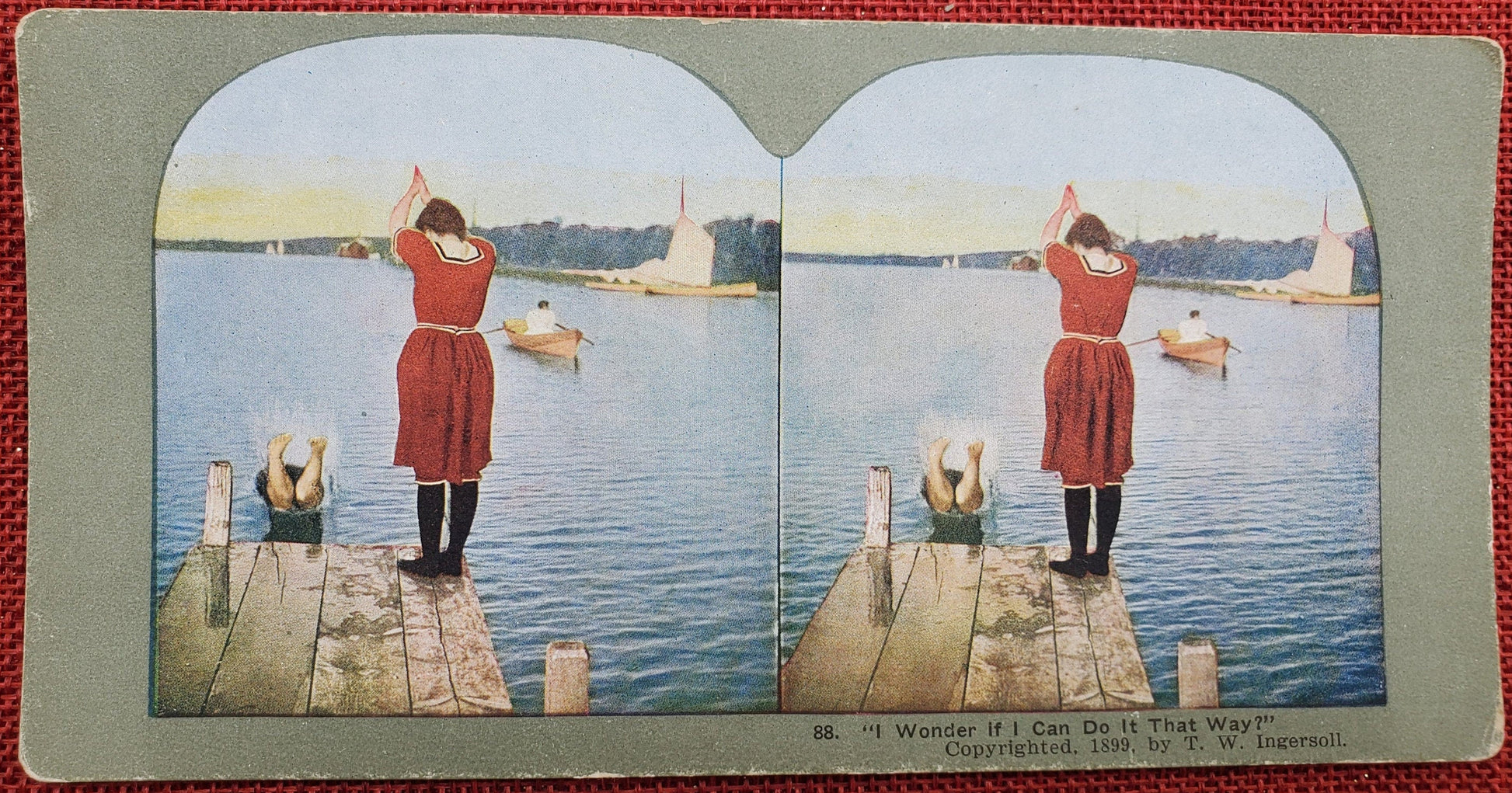 This vintage stereo view card features two color images of someone diving and another preparing to dive in after them.