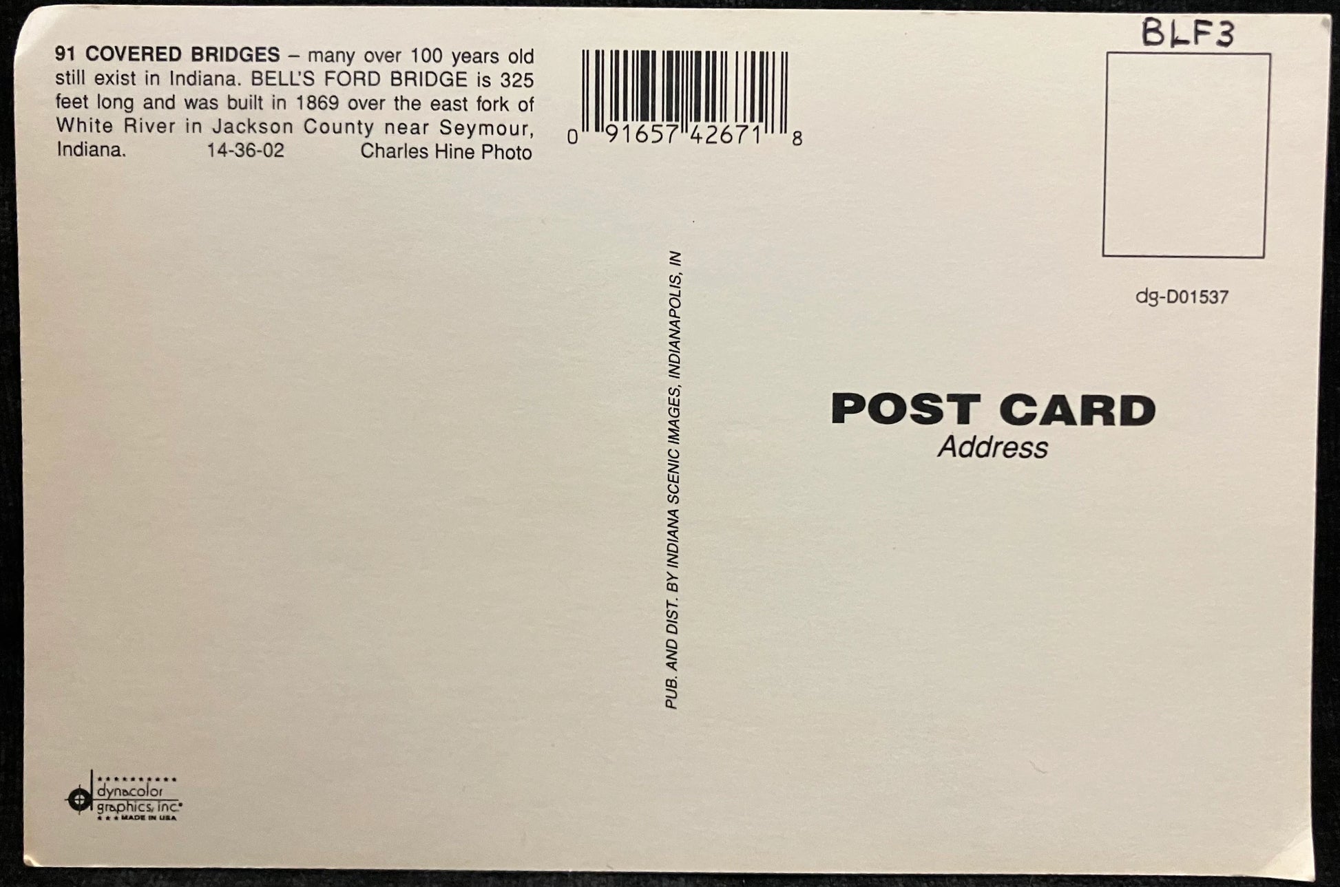 Back: Covered Bridges - many over 100 years old still exist in Indiana. BELL’S FORD BRIDGE is 325 feet long and was built in 1869 over the east fork of White River in Jackson County near Seymour, Indiana.