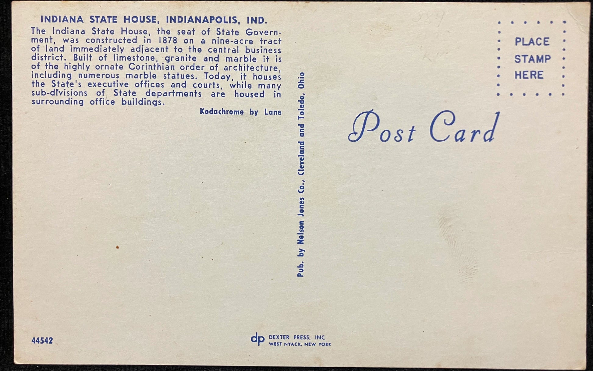 On back: INDIANA STATE HOUSE, INDIANAPOLIS, IND. The Indiana State House, the seat of State Government, was constructed in 1878 on a nine-acre tract of land immediately adjacent to the central business district. Built of limestone, granite and marble it is of the highly ornate Corinthian order of architecture, including numerous marble statues. Today, it houses the State’s executive offices and courts, while many sub-divisions of State departments are housed in surrounding office buildings.