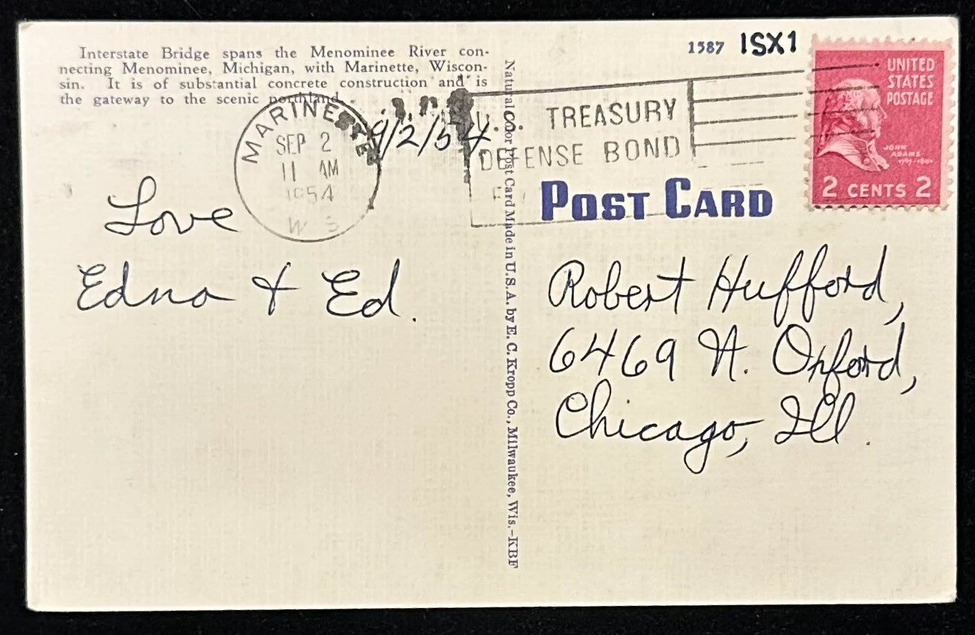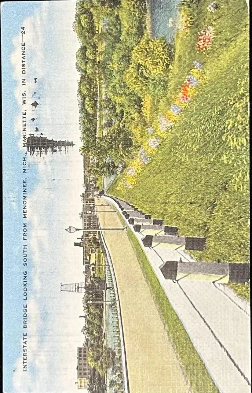 Back: Interstate Bridge spans the Menominee River, connecting Menominee, Michigan, with Marinette, Wisconsin. It is of substantial concrete construction and is the gateway to the scenic Northland. | followed by a handwritten note