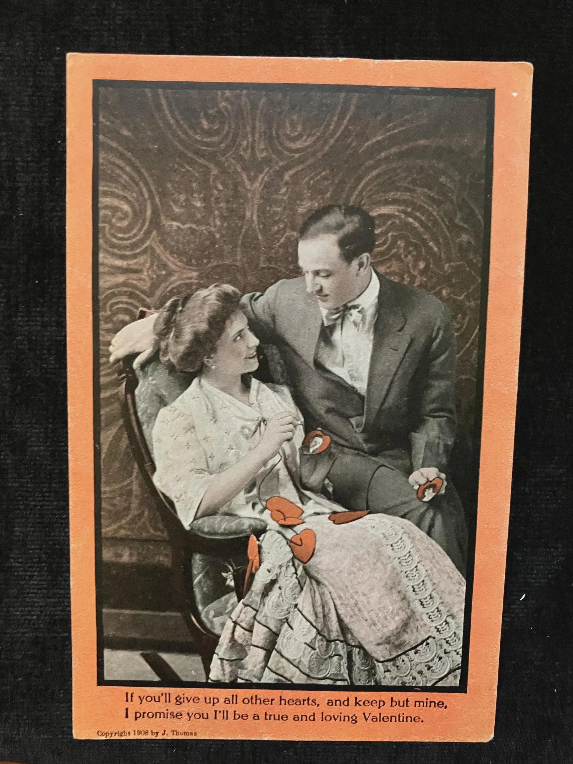 “If you’ll give up all other hearts and keep but mine, I promise you I’ll be a true and loving Valentine.” Copyright in 1908 by J. Thomas.