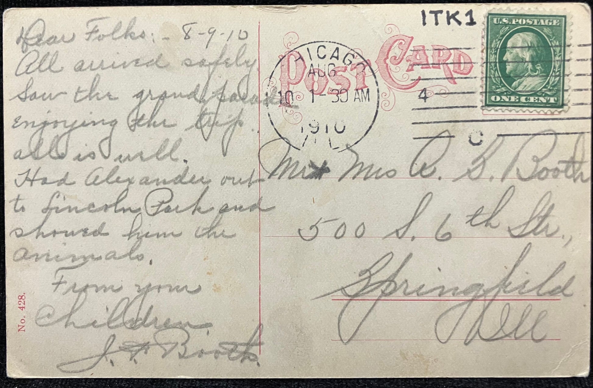 Mailed: Postmark in 1910 from Chicago, Ill. with a green one cent Benjamin Franklin postcard