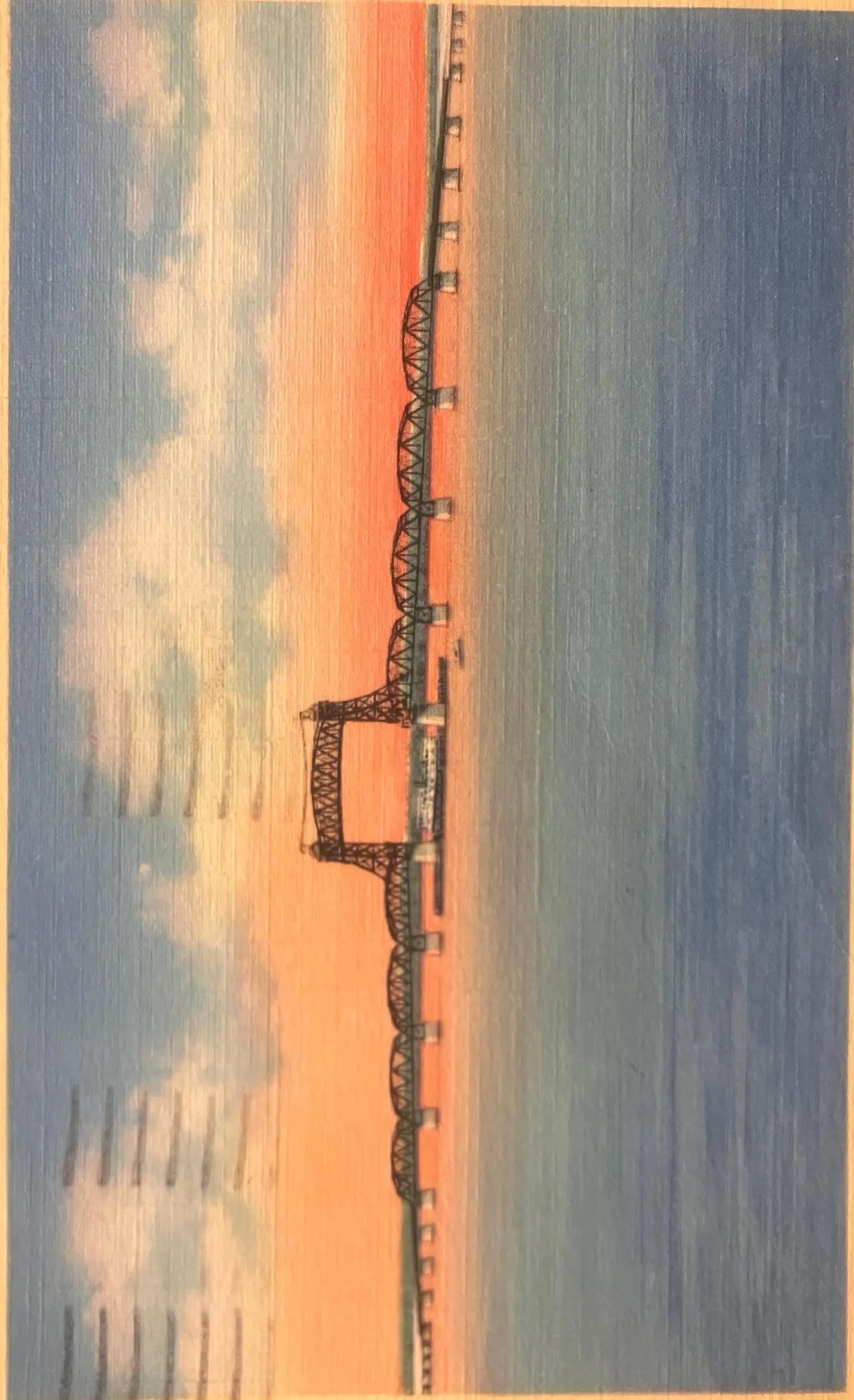 Back: JAMES RIVER BRIDGE, NEAR NEWPORT NEWS, VA. Across the mouth of the James River, four and one-half miles in length, over open, tidal water and is trashed bent type with vertical lift span.