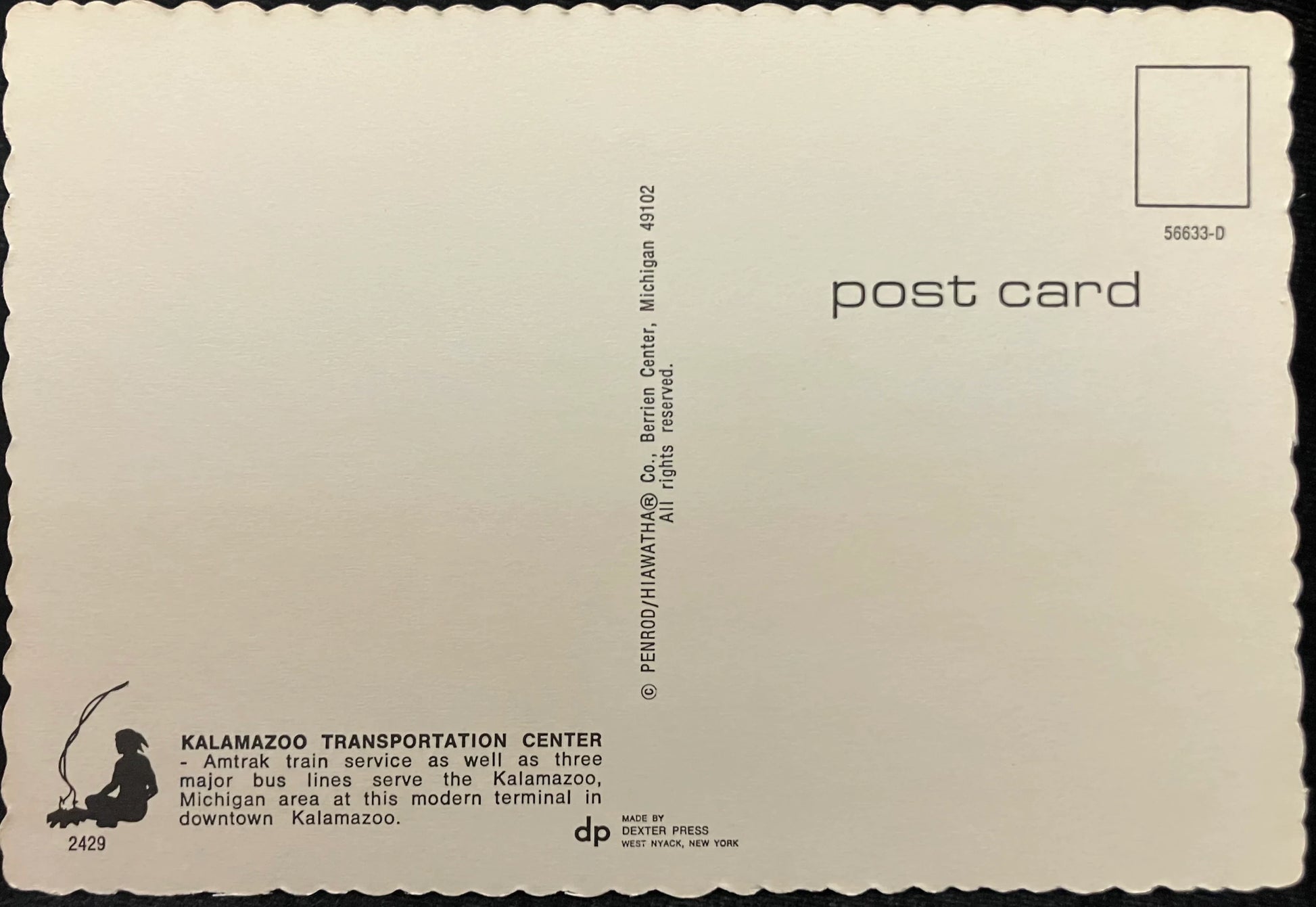 On back: Kalamazoo, Transportation Center - Amtrak train service as well as threee major bus lines serve the Kalamazoo, Michigan area at this modern terminal in downtown Kalamazoo.