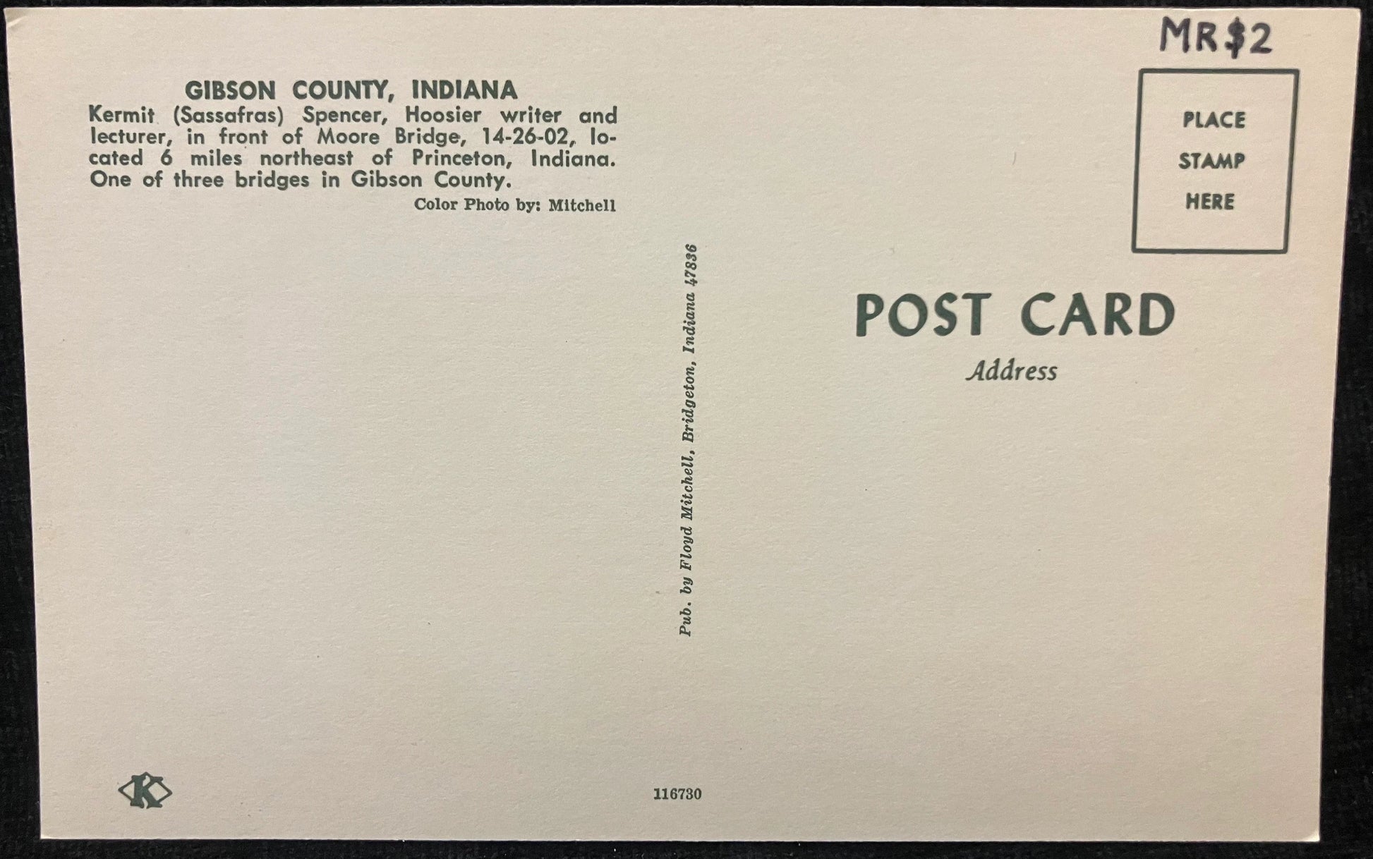 Back: GIBSON COUNTY, INDIANA Kermit (Sassafras) Spencer, Hoosier writer and lecturer, in front of Moore Bridge, 14-26-02, located 6 miles northeast of Princeton, Indiana. One of t he tree bridges in Gibson County.