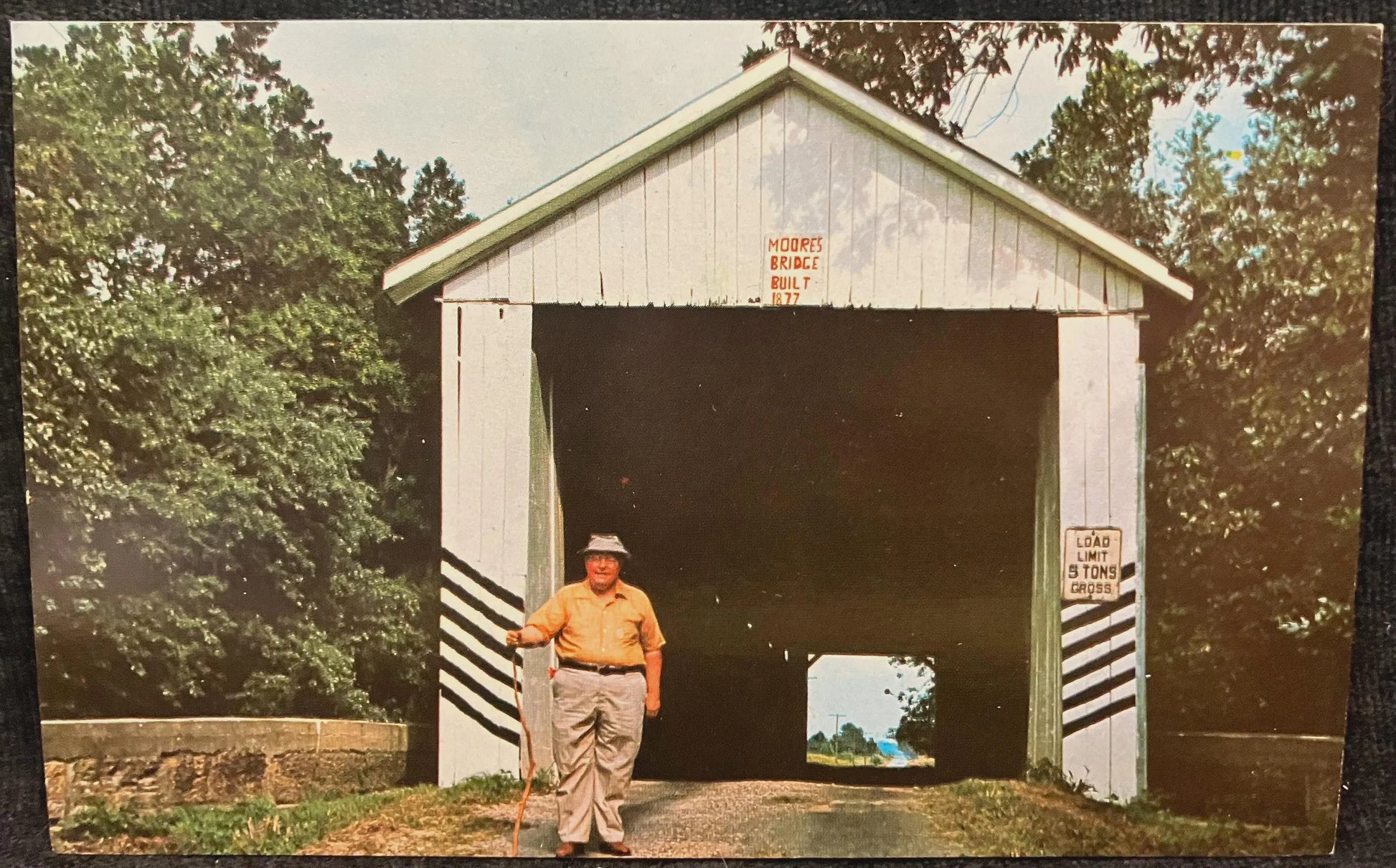Kermit (Sassafras) Spencer in front of Moore Bridge in Gibson County, Indiana - Photo: Mitchell - Vintage Covered Bridge Postcard