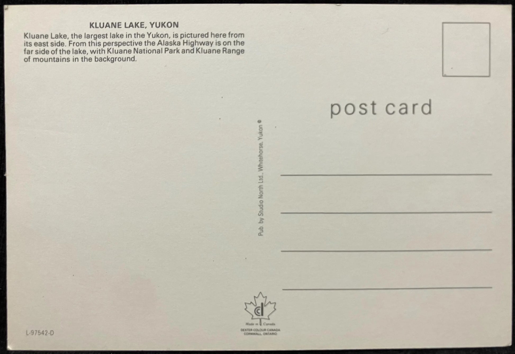 Back: KLUANE LAKE, YUKON Kluane Lake, the largest lake int eh Yukon, is pictured here from its east side. From this perspective the Alaska Highway is on the far side of the lake, with Kluane National Park nd Lane Range of the mountains in the background.