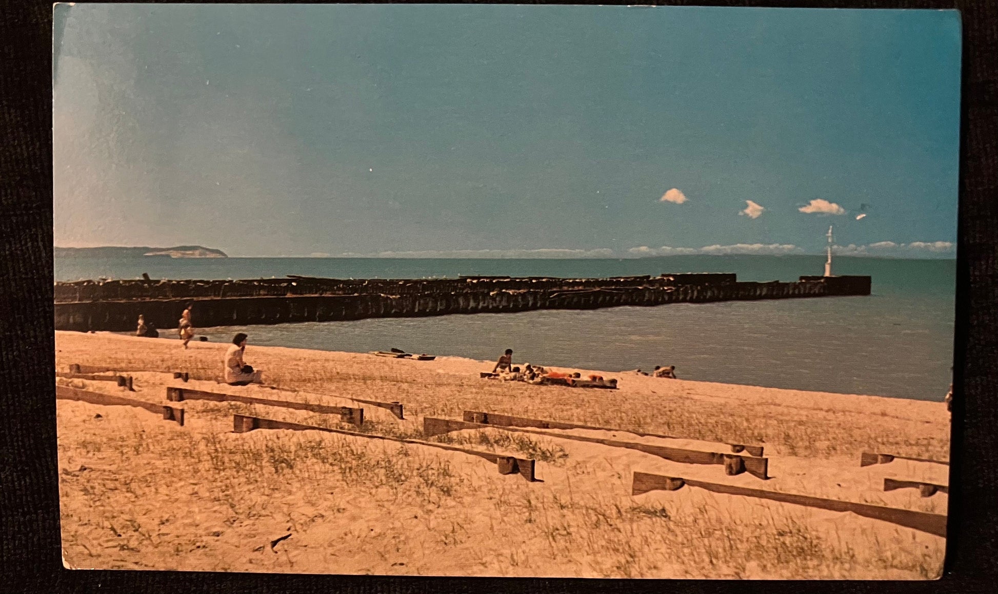 On back: Lake Michigan - Bathers sun themselves on the beach at Leland, Michigan. The Breakwaters i the entrance into the Leland harbor.