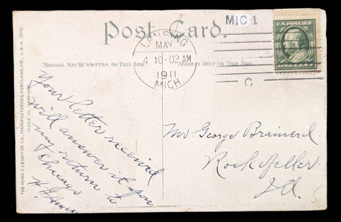 Mailed. Postmarked May 4, 1911 from Lansing Michigan. Green one cent Benjamin Franklin stamp.